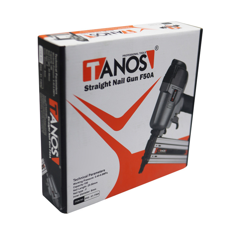 میخ‌کوب بادی تانوس مدل F50A با ظرفیت محفظه میخ 100 عدد با طول میخ بین 20 الی 50 میلی متر و نوع میخ F طراحی و تولید شده است. فشار باد مناسب این دستگاه بین 4.5 تا 8 بار بوده و از بدنه آلومینیومی سبک و قدرتمند با روکش پلاستیکی ارگونومیک ساخته شده است. طراحی منحصر به فرد دماغه دستگاه برای کوبش دقیق و آسان میخ است و ضامن ایمنی آن به منظور جلوگیری از عملکرد ناخواسته تعبیه شده است.میخ‌های اسکا قابل پشتیبانی 25، 30 تا 50 میلی‌متر هستند.