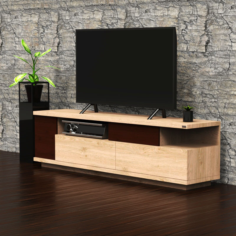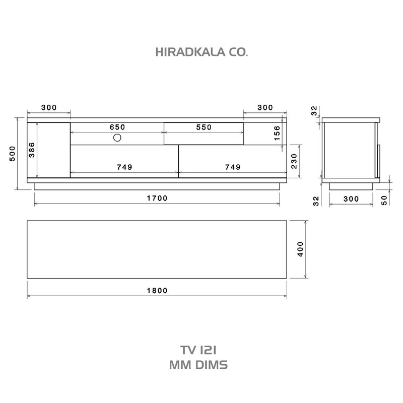 ابعاد میز تلویزیون هیراد مدل TV121به اندازه 180 در 40 سانتیمتر میباشد. بهعلاوه، ارتفاع 50 سانتیمتری آنکه هماهنگ باحالت نشسته است، لذت تماشای تلویزیون را به شما داده و باعث میشود که در حین تماشای برنامه دلخواه خود، نیازی به تغییر جا و یا ارتفاعتان نداشته باشید.این میز مجهز به دو کشو کاربردی بوده که جای لازم برای وسایل دلخواه کاربران را فراهم کرده است. همچنین برای استقرار دیگر لوازم صوتی و تصویری، مانند سینمای خانگی، کنسولهای بازی، انواع گیرندهها و پخشکنندهها، دو طبقهی مجزا در قسمت میانی میز در نظر گرفته شده است.این میز تلویزیون به شکل مونتاژ شده در بسته بندی ارسال خواهد شد و شما نیازی به هیچگونه نصب لوازم و قطعات آن ندارید.جنس این محصول ام دی اف می باشد