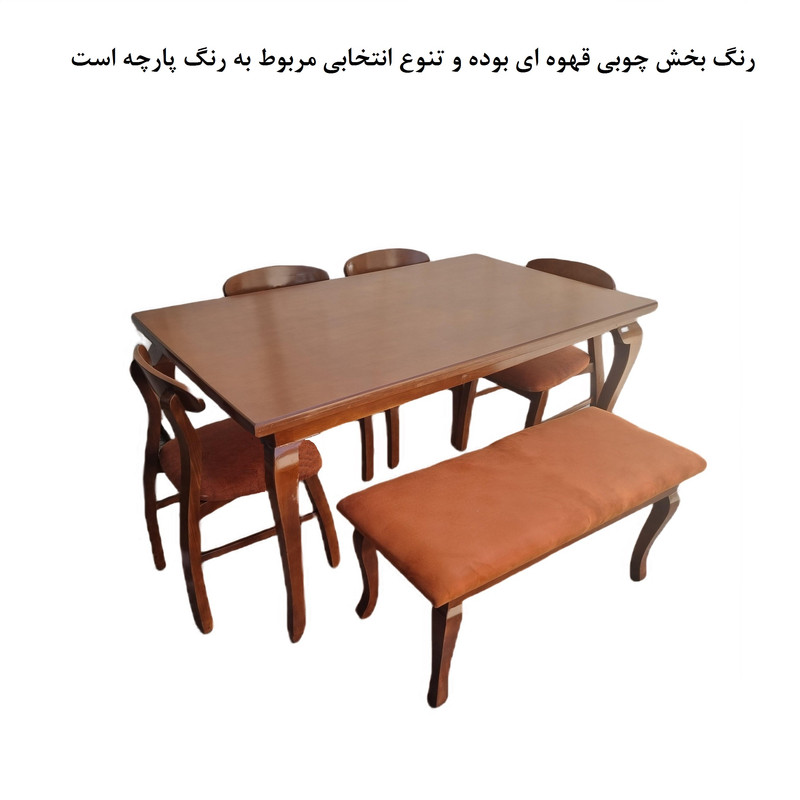 | سایر توضیحات | تنوع رنگ انتخابی شما مربوط به رنگ پارچه صندلی ها می باشد. | درجه بندی کیفیت : رنگ آمیزی و نجاری عالی و مقرون به صرفه | فروشنده اصلی این محصول برند گالری چوب آشنایی بوده، در هنگام خرید به این موضوع توجه فرمایید.| نماهایی که در دید نیستند، رنگ اصلی چوب است. | به مشخصات دقیق محصول دقت کرده و توجه کنید محصول با مشخصات ذکر شده را فقط گالری چوب آشنایی ارائه مینماید. | چوب روسی(نراد).| ممکن است بدلیل عکاسی تفاوت جزئی در رنگها باشد. |