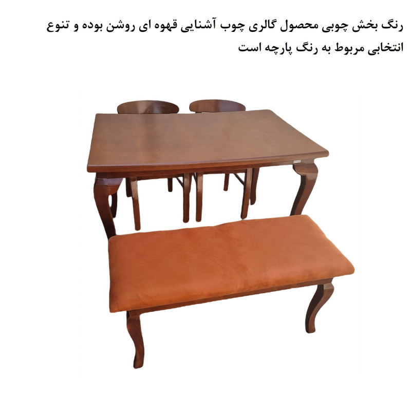 | سایر توضیحات | رنگ چوب قهوه ای روشن بوده و ثابت است تنوع رنگ انتخابی شما مربوط به رنگ پارچه صندلی ها می باشد. | درجه بندی کیفیت : رنگ آمیزی و نجاری عالی و مقرون به صرفه | فروشنده اصلی این محصول برند گالری چوب آشنایی بوده، در هنگام خرید به این موضوع توجه فرمایید.| نماهایی که در دید نیستند، رنگ اصلی چوب است. | به مشخصات دقیق محصول دقت کرده و توجه کنید محصول با مشخصات ذکر شده را فقط گالری چوب آشنایی ارائه مینماید. | ممکن است بدلیل عکاسی تفاوت جزئی در رنگها باشد.| چوب روسی(نراد) |