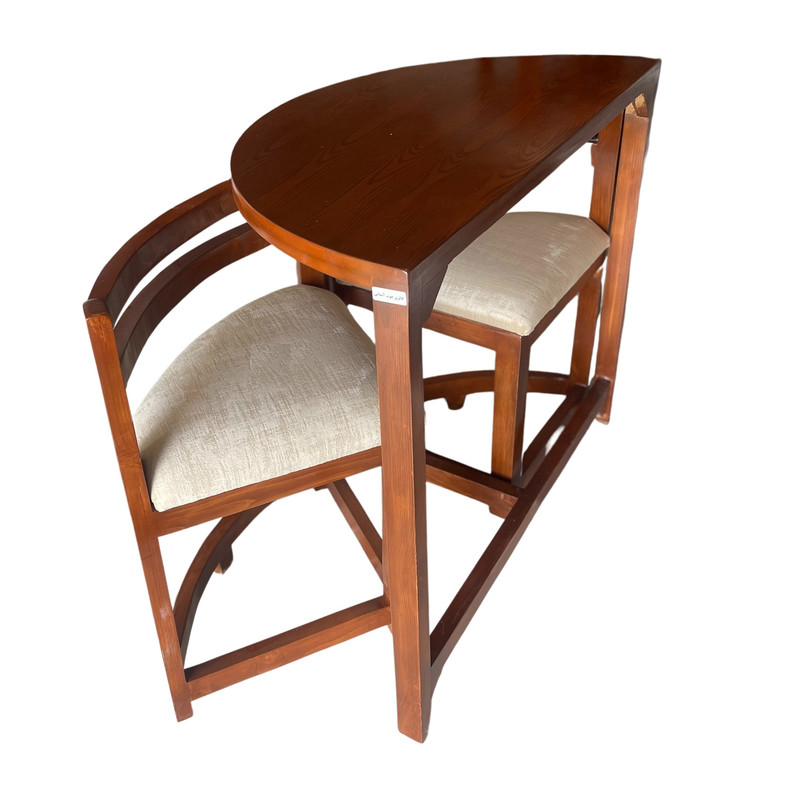توضیحات میزمیز به صورت نیم دایره است.| ضخامت چوب در پایه های میز حدودا 5x3 سانتیمتر.| دارای اتصالات بسیار محکم