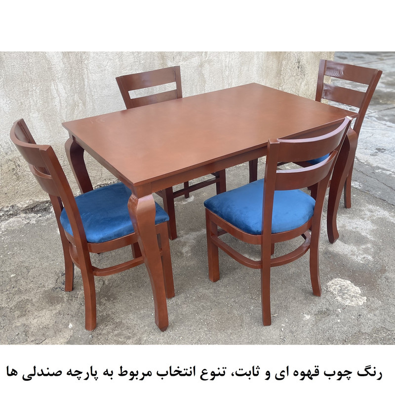 | سایر توضیحات | تنوع رنگ انتخابی شما مربوط به رنگ پارچه صندلی ها می باشد. | درجه بندی کیفیت : رنگ آمیزی و نجاری عالی و مقرون به صرفه | فروشنده اصلی این محصول برند گالری چوب آشنایی بوده، در هنگام خرید به این موضوع توجه فرمایید.| نماهایی که در دید نیستند، رنگ اصلی چوب است. | به مشخصات دقیق محصول دقت کرده و توجه کنید محصول با مشخصات ذکر شده را فقط گالری چوب آشنایی ارائه مینماید. | چوب روسی(نراد).| ممکن است بدلیل عکاسی تفاوت جزئی در رنگها باشد. |