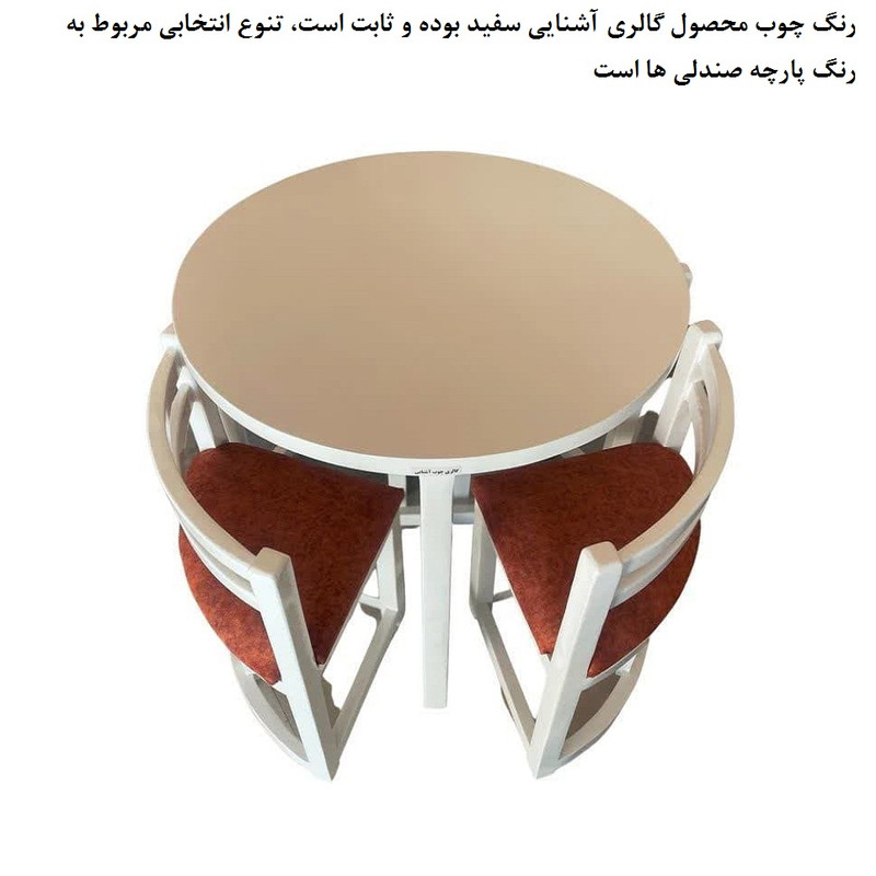 سایر توضیحات رنگ چوب سفید بوده و ثابت است و تنوع انتخابی مربوط به رنگ پارچه صندلی ها است.| در هنگام خرید به فروشنده اصلی برند این محصول توجه فرمایید.|ممکن است به دلیل نور عکاسی رنگها تفاوت جزئی داشته باشد.| نماهایی که در دید نیستند، به رنگ اصلی چوب است.| ابعاد حدودی است