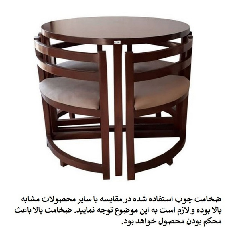 میز و صندلی غذاخوری مدل جدید کمجا یک محصول بسیار مفید و کارآمد و در عین حال با کمترین فضای اشغالی می باشد. این میز و صندلی های گالری آشنایی یکی از با کیفیت ترین و زیباترین محصولات است که با طراحی زیبایی که دارند، بسیار جذاب می باشند. این میز و صندلی ضخامت چوب استفاده شده در آن حدود 4-5 سانتی متر میباشد. این محصول تحمل وزن بسیار بالایی داشته و جزء کارهای بسیار پرفروش می باشد و طرفداران زیادی دارد. توجه کنید که این محصول دارای ضخامت چوب بالایی بوده و توسط فروشنده اصلی گالری چوب آشنایی به فروش میرسد/.