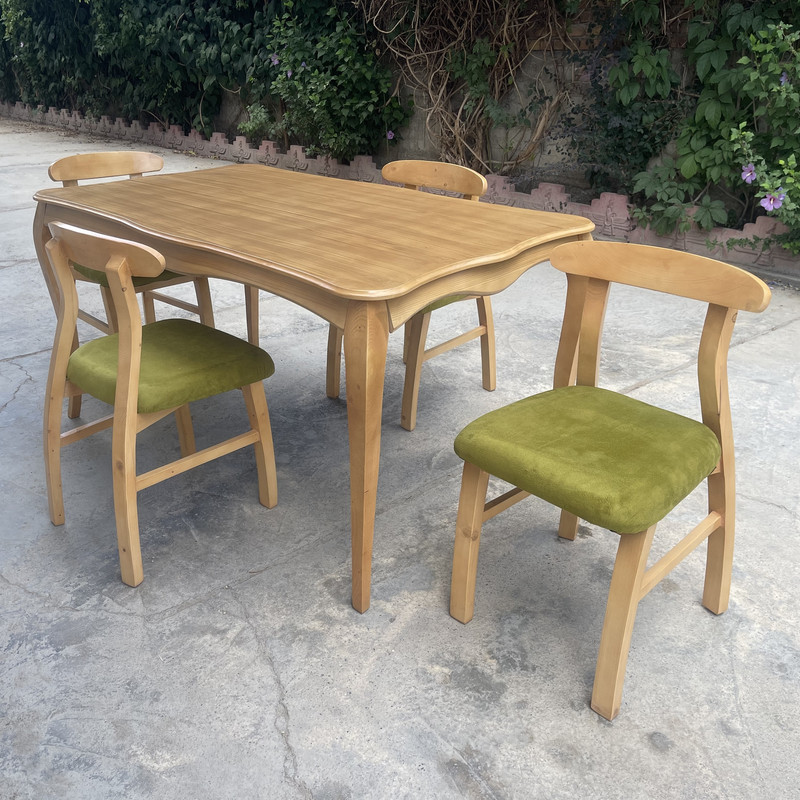 | سایر توضیحات | رنگ بخش چوبی خودرنگ بوده و ثابت میباشد. | تنوع رنگ انتخابی شما مربوط به رنگ پارچه صندلی ها می باشد. | درجه بندی کیفیت : رنگ آمیزی و نجاری عالی و مقرون به صرفه .| نماهایی که در دید نیستند، رنگ اصلی چوب است(همانند ته پایه های میز که از زیر به میز مونتاژ میشود) | ابعاد در حد 3الی4 سانتیمتر ممکن است خطا داشته باشد.| ممکن است موج صفحه متفاوت باشد.| امکان دارد برخی نقاط صفحه موجها برجسته باشد.| ممکن است در هر سری تولید، رنگ چوب بدلیل ساخت دستی رنگ تفاوت جزئی داشته باشد.| به مشخصات دقیق محصول دقت کنید. | ممکن است بدلیل عکاسی تفاوت جزئی در رنگها باشد.| |