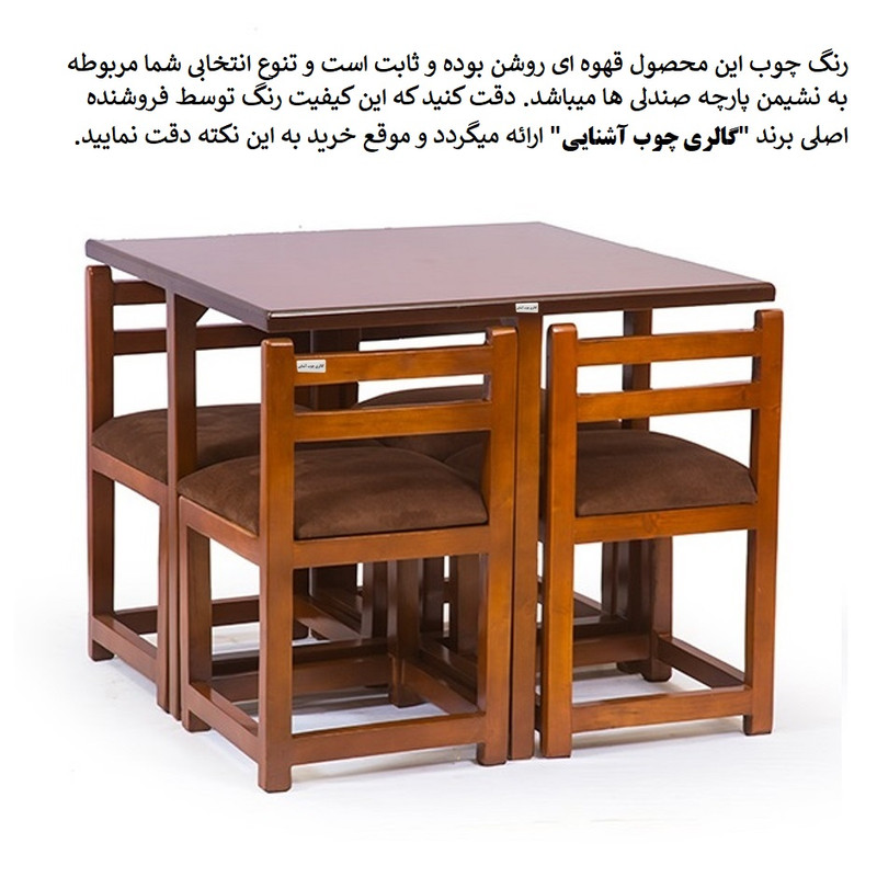 | سایر توضیحات | رنگ بخش چوبی این کار قهوه ای روشن بوده، تنوع رنگ انتخابی شما مربوط به رنگ پارچه صندلی ها می باشد. |درجه بندی کیفیت : نجاری و رنگ آمیزی عالی و بسیار مقرون به صرفه.| فروشنده اصلی این محصول برند گالری چوب آشنایی بوده و در هنگام خرید به این موضوع توجه فرمایید و کیفیت اصلی این محصول رو از همین فروشنده تهیه نمایید| ممکن است به دلیل نور عکاسی رنگها تفاوت جزئی داشته باشد.| دارای موجهای شکیل و زیبا(بدلیل طرح اصلی چوب).| به مشخصات دقیق محصول دقت کرده و توجه کنید محصول با مشخصات ذکر شده را فقط گالری چوب آشنایی ارائه مینماید.| نماهایی که در دید نیستند، به رنگ اصلی چوب است.(همانندصلیبی پایه میز که صفحه بر روی آن قرار میگیرد) .| |