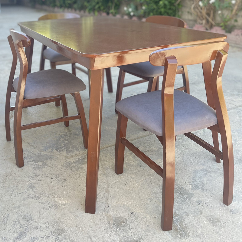 | سایر توضیحات | رنگ چوب ثابت و قهوه ای است(همانند تصویر) و تنوع رنگ انتخابی شما مربوط به رنگ پارچه صندلی ها می باشد. | نماهایی که در دید نیستند، به رنگ اصلی چوب است. همانند کف (ته) پایه های میز که به خود میز وصل میگردد |