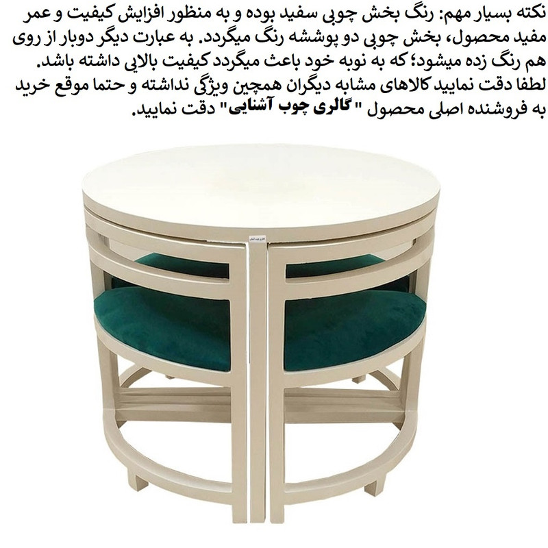 سایر توضیحات دو پوششه بودن رنگ سفید.| رنگ بخش چوبی این کار سفید بوده، تنوع رنگ انتخابی شما مربوط به رنگ پارچه صندلی ها می باشد. |درجه بندی کیفیت : نجاری و رنگ آمیزی عالی و بسیار مقرون به صرفه.| فروشنده اصلی این محصول برند گالری چوب آشنایی بوده و در هنگام خرید به این موضوع توجه فرمایید و کیفیت اصلی این محصول رو از همین فروشنده تهیه نمایید| ممکن است به دلیل نور عکاسی رنگها تفاوت جزئی داشته باشد.| دارای موجهای شکیل و زیبا(بدلیل طرح اصلی چوب).| به مشخصات دقیق محصول دقت کرده و توجه کنید محصول با مشخصات ذکر شده را فقط گالری چوب آشنایی ارائه مینماید.| نماهایی که در دید نیستند، به رنگ اصلی چوب است.