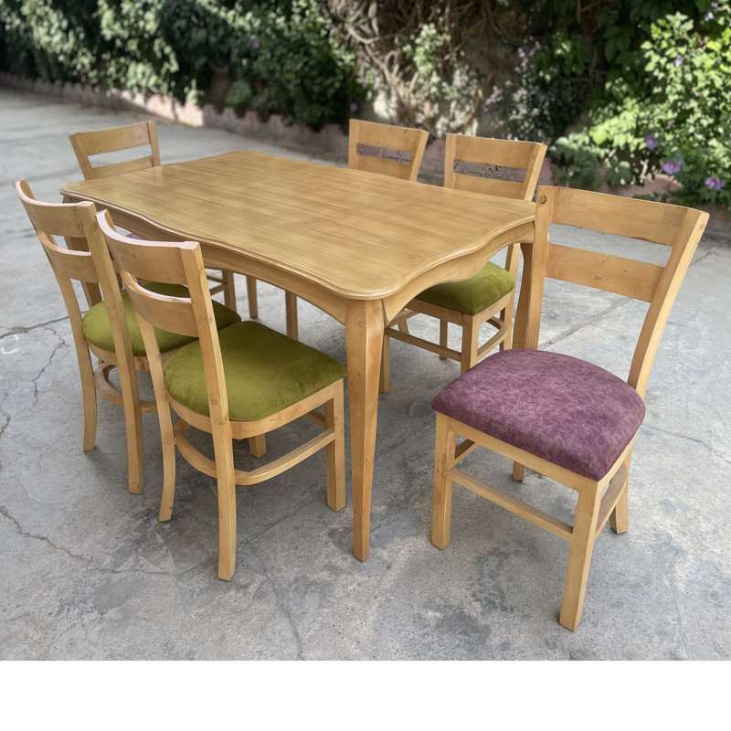 | سایر توضیحات | رنگ بخش چوبی خودرنگ بوده و ثابت میباشد. | تنوع رنگ انتخابی شما مربوط به رنگ پارچه صندلی ها می باشد. | درجه بندی کیفیت : رنگ آمیزی و نجاری عالی و مقرون به صرفه .| نماهایی که در دید نیستند، رنگ اصلی چوب است(همانند ته پایه های میز که از زیر به میز مونتاژ میشود) | ابعاد در حد 3الی4 سانتیمتر ممکن است خطا داشته باشد.| ممکن است موج صفحه متفاوت باشد.| امکان دارد برخی نقاط صفحه موجها برجسته باشد.| ممکن است در هر سری تولید، رنگ چوب بدلیل ساخت دستی رنگ تفاوت جزئی داشته باشد.| به مشخصات دقیق محصول دقت کنید. | ممکن است بدلیل عکاسی تفاوت جزئی در رنگها باشد.| |