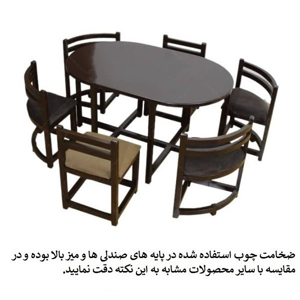 سایر توضیحات به ضخامت چوب استفاده شده در این محصول در مقایسه با سایر محصولات مشابه دقت فرمایید.| درجه بندی کیفیت : رنگ آمیزی و نجاری عالی و مقرون به صرفه.| نماهایی که در دید نیستند، به رنگ اصلی چوب است.| به مشخصات دقیق محصول از جمله ضخامت چوب دقت کرده و توجه کنید محصول با مشخصات ذکر شده را فقط فروشنده اصلی محصول با برند گالری چوب آشنایی ارائه مینماید. چوب روسی(نراد).| رنگ چوب قهوه ای تیره و ثابت.| تنوع رنگ انتخابی مربوط به رنگ پارچه صندلی ها است.| تنوع رنگ چند رنگ پارچه دو صندلی وسط کرم و صندلی های کناری طوسی خواهد بود.
