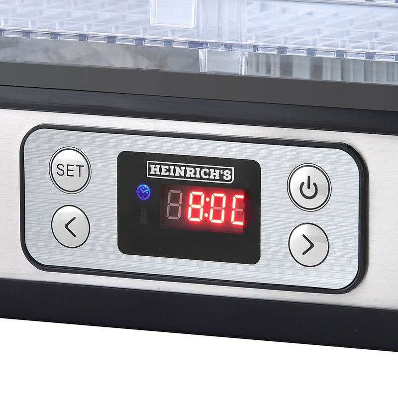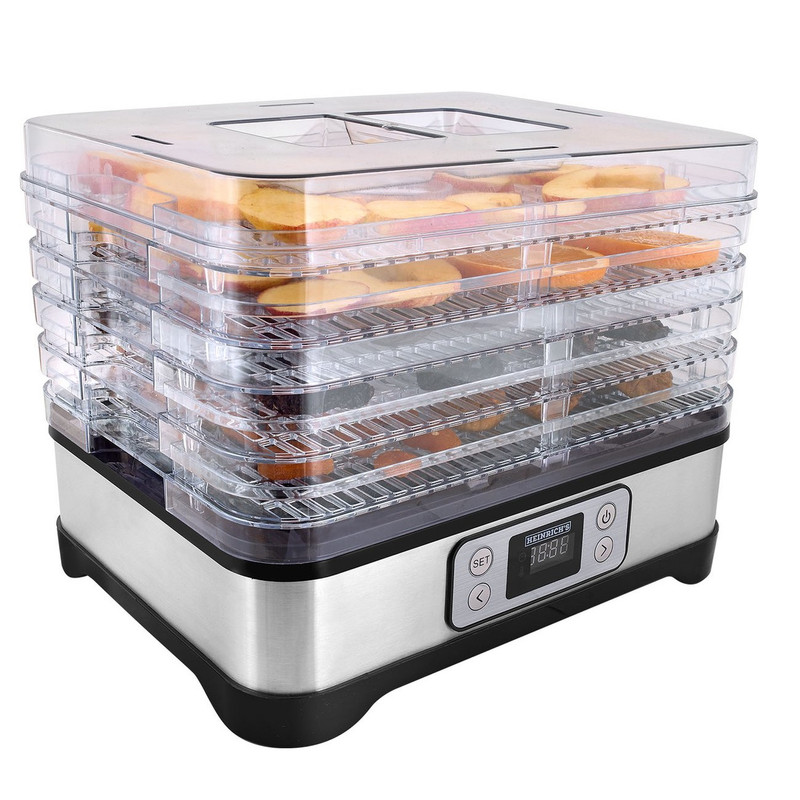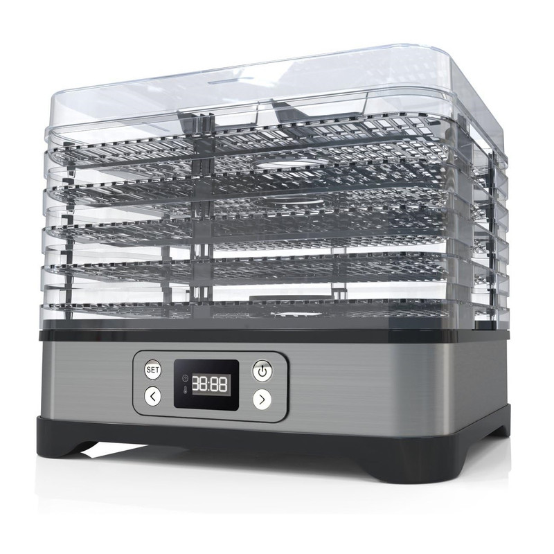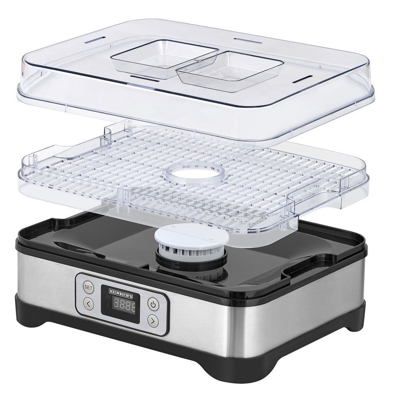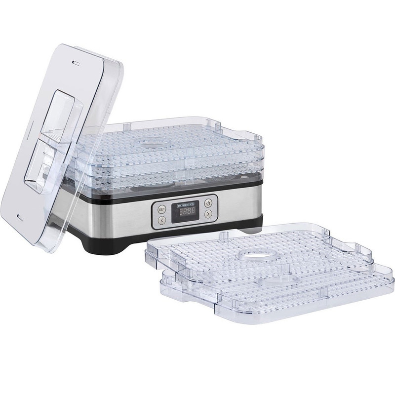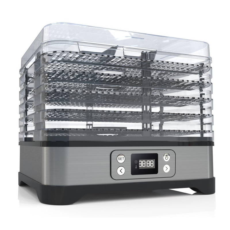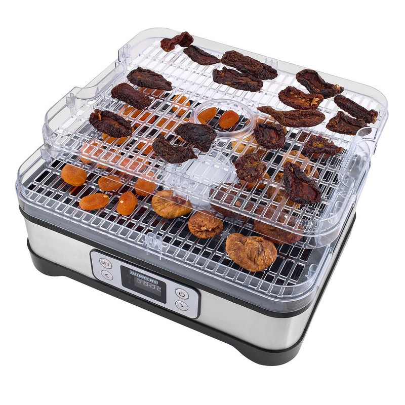 سایر ویژگی‌هاخشک‌کن مواد غذایی از جنس استیل ضد زنگ، با صفحه نمایش LCD، 250 وات. میوه‌ها، سبزیجات، گوشت و گیاهان مورد علاقه خود را به سرعت، به راحتی و با صرفه اقتصادی خشک کنید. از غذاهای غنی از مواد معدنی لذت ببرید. تا 97٪ ویتامین‌ها و مواد معدنی را حفظ می‌کند. جریان دایره‌ای و یکنواخت هوای گرم. پوشش استیل ضد زنگ. قابلیت تنظیم دما از 35 تا 70 درجه سانتیگراد. پنج سطح قرارگیری مواد غذایی. صفحه نمایش LCD با نشانگر سطح دمای دیجیتال. تایمر تا 72 ساعت با نشانگر زمان باقی مانده. قفسه‌ها را می‌توان در دو ارتفاع مختلف تنظیم کرد.بدون پلاستیک BRA. منبع تغذیه: 220-240 ولت، 50/60 هرتز.