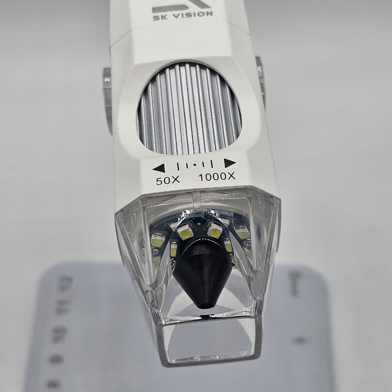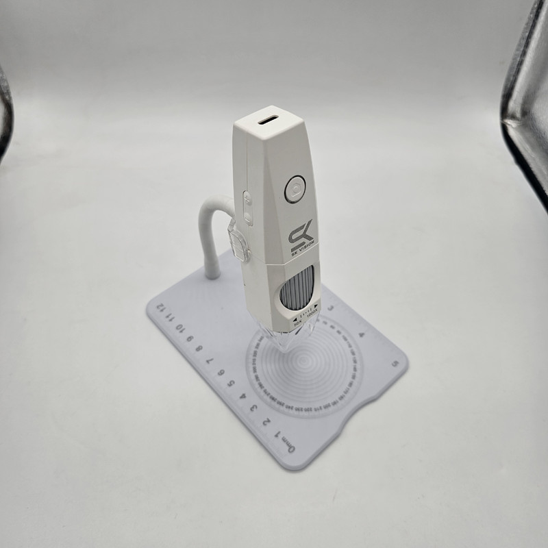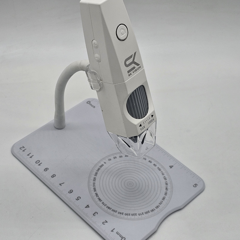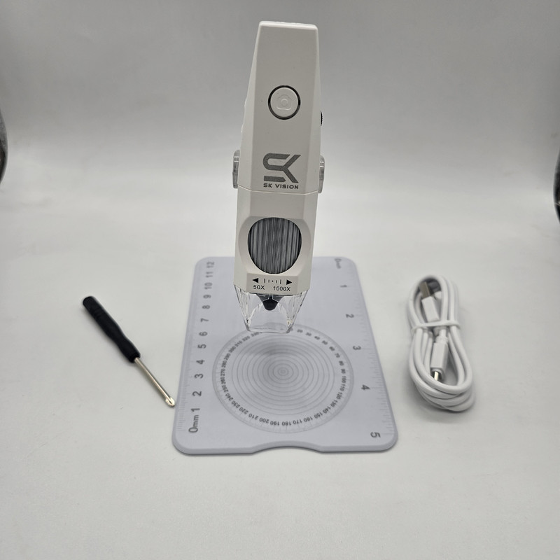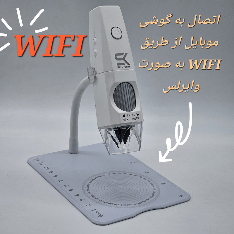 میکروسکوپ دیجیتال اسکای ویژن مدل 1000X با ابعاد کوچک و حمل آسان. میکروسکوپ دستی دیجیتال ، میکروسکوپی مخصوص همه است و کاربری آسانی دارد. بعد از نصب نرم افزار و اتصال به گوشی موبایل از طریق WIFI بدون نیاز به مودم و اینترنت و به صورت بی سیم. میکروسکوپ را روی شئ یا سطح موردنظر قرار دهید، با پیچ تنظیم روی میکروسکوپ بزرگنمایی حداکثر تا 1000 (50-1000 برابر) را بدست آورید و تصویر را در گوشی خود خود ببینید. داری پایه نگهدارنده مخصوص با خط کشی. دارای کیفیت تصویر 1080p full HD نرم افزار مخصوص اندروید و IOS یه صورت وايرلس و هم در کامپیوتر به صورت سیمی با این میکروسکوپ میتوانید سطح پوست، حشرات، گیاهان، سنگها، تمبر، سکه، جواهرات و بردهای الکتریکی را با جزئیات مشاهده کنید. این میکروسکوپ برای آموزش کودکان و نوجوانان و استفاده بزرگسالان، تعمیرکاران الکترونیک، مهندسان، زیستشناسان و هر شخصی که نیاز به بزرگنمایی داشته باشد مورد استفاده بوده و برای مشاغلی مانند تعمیرات موبایل، کامپیوتر و... مناسب است.این میکروسکوپ قابلیت اتصال به گوشی های دارای درگاه یو اس بی تایپ سی است قابلیت ضبط فیلم و عکس بر روی گوشی دارای پایه قابل تنظیم. این وسلیه کاربرد زیادی در صنعت طلا سازی و جواهر سازی نیز دارد