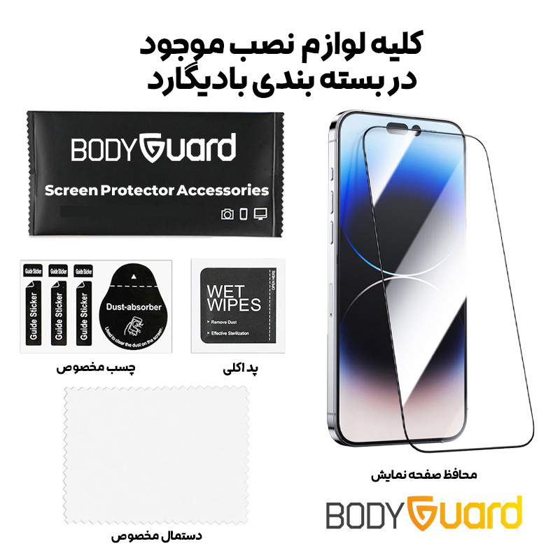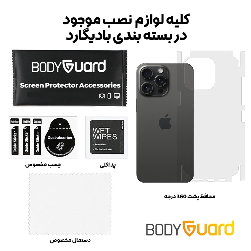 | اقلام همراه | گلس شیشه ای - برچسب پشت 360 (کاور پشت و کناره ها) - پد الکلی - کاردک - دستمال خشک - برچسب گرد و غبار |