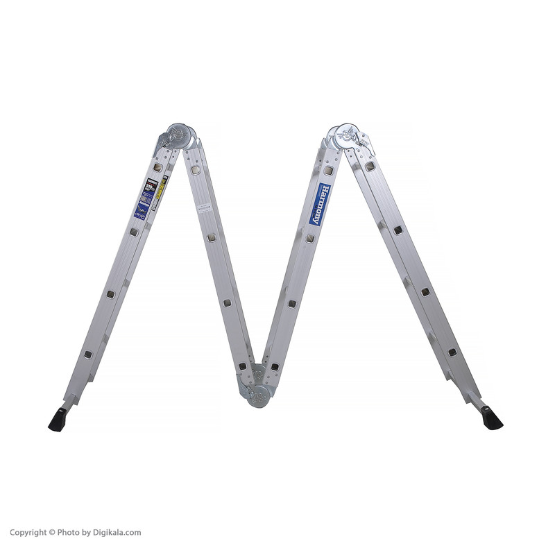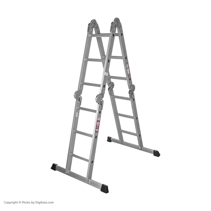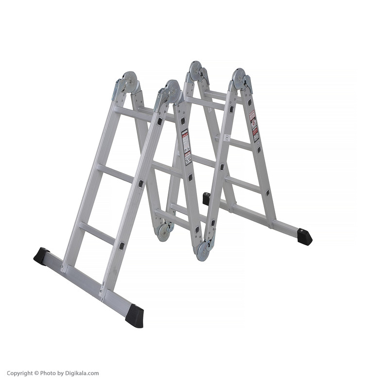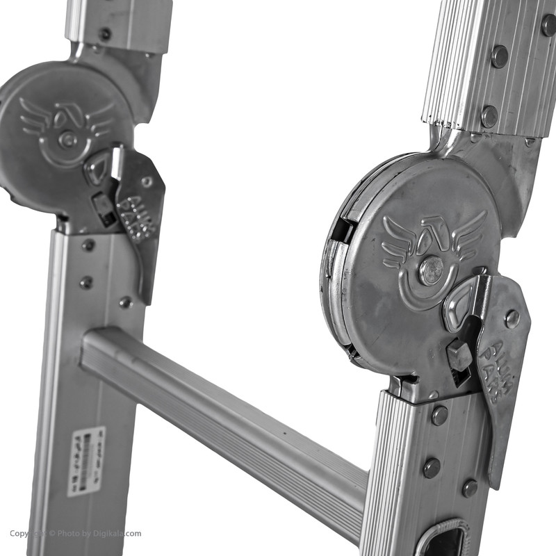 اقلام همراه - نردبان مفصلی - چند منظوره - امکان استفاده به صورت هشتی دو طرفه، خرپا، تمام باز دیواری - امکان تاشدن و کم‌جا - دارای پایه‌ تعادل - دارای قفل - دارای گواهینامه استاندارد ایران - ارتفاع در حالت باز شده: 485 سانتی‌متر