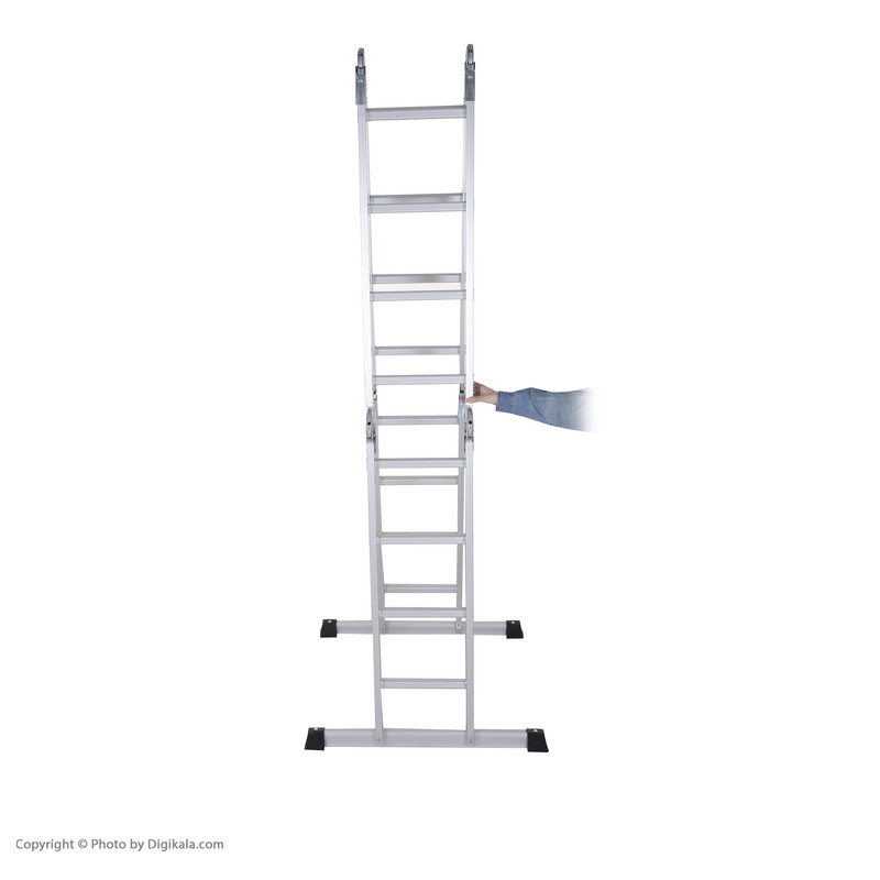 اقلام همراه- نردبان مفصلی - چند منظوره - امکان استفاده به صورت هشتی دو طرفه، خرپا، تمام باز دیواری - امکان تاشدن و کم‌جا - دارای پایه‌ تعادل - دارای قفل - دارای گواهینامه استاندارد ایران - ارتفاع در حالت باز شده: 485 سانتی‌متر