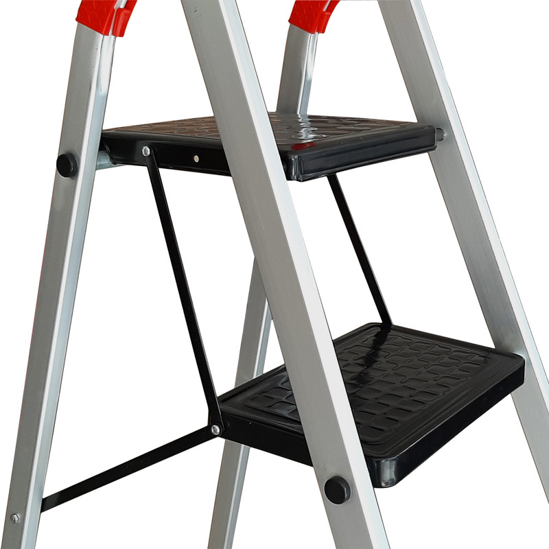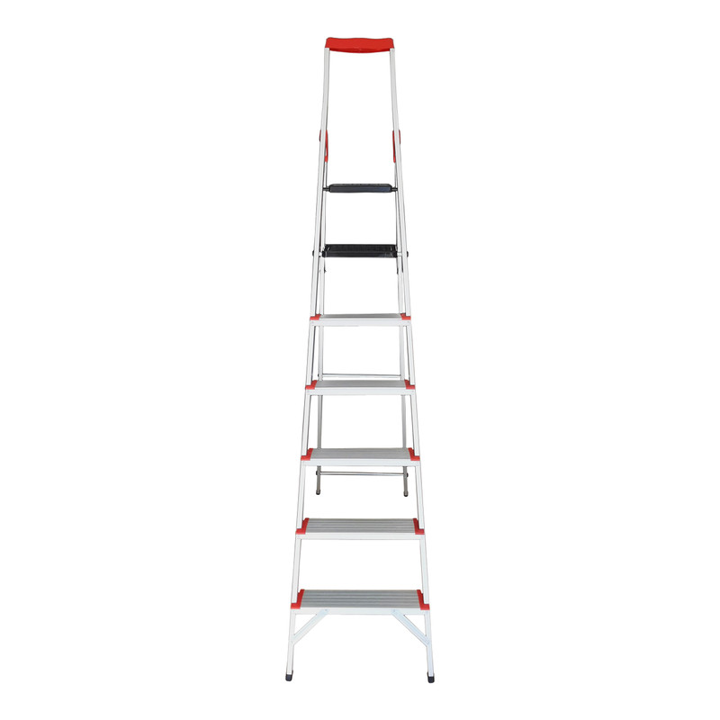 نردبان 7 پله یوکسل +2 از جنس آلومینیوم فابریک و نمونه دیزاین آلمانی است. به نسبت نردبان های قدیمی یوکسل، مدل جدید +2 دارای 2 پله ی پهن در بالای نردبان می باشد و نیز ارتفاع آن 25 سانتی متر بیشتر از مدل های قبلی است که این وجه تمایز دسترسی به ارتفاع بالاتر با همان تعداد پله را میسر می سازد. همچنین طراحی 2 پله ی پهن در بالای این نردبان، ایستادن طولانی مدت در پله ی پایینی را هم برای فرد فراهم ساخته است. این نردبان علاوه بر وزن بسیار کم از استحکام بسیار بالایی نسبت به مدل های قبلی برخوردار است و همین قابلیت این محصول را از سایر محصولات مشابه متمایز کرده است. دیگر ویژگی برجسته ی این نردبان برخورداری از پله های پهن طول 12 سانتیمتری در پایین است که نه تنها به تعادل و امنیت هرچه بیشتر شما کمک می کند، بلکه به زیبایی آن نیز می افزاید و شباهت آن را به نمونههای آلمانی بیشتر میکند. وزن این محصول حدود 8 کیلوگرم با تحمل وزن 130 کیلوگرم است به طوری که هر فردی، حال چه مسن و چه خرد سال به راحتی قادر به حمل آن خواهند بود . ارتفاع این نردبان برای خانهها و فضاها با سقف بلند بسیار مناسب است و به شما این امکان را میدهد که به نحو احسنت به سقف و یا سطوح بالا دسترسی و تسلط داشته باشید. پایههای این محصول از جنس پلاستیک است و احتمال سر خوردن را به حداقل میرساند و داشتن ابعاد بزرگتر در دو طبقه فوقانی به شما تعادل و راحتی بالایی میبخشد و دچار لرزش نخواهد شد. این نردبان دارای جایگاه ابزار در بخش بالای دسته است و باعث سهولت در انجام کارهایی نظیر دریل کاری، چوب پرده زدن وکارهای فنی است. قسمت بالای نردبان دارای جایگاه تکیه گاه است و به فرد امنیت و تعادل بالایی برای ایستادن در پله ی آخر را می دهد.