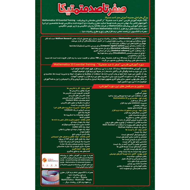 سایر توضیحات | دارای قفل نرم افزاری و قابل فعال سازی بر روی 5 سیستم مجزا - 200 دقیقه آموزش صفر تا صد متمتیکا به زبان فارسی - آموزش پروژه محور همراه با فایل های تمرینی - برگرفته از دوره های معتبر آموزشی سطح یک جهانی - ترجمه تخصصی توسط متخصصین ایرانی - همراه با نسخه کامل نرم افزار Wolfram Mathematica v10.0.2 |