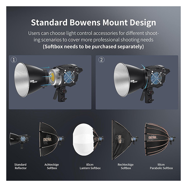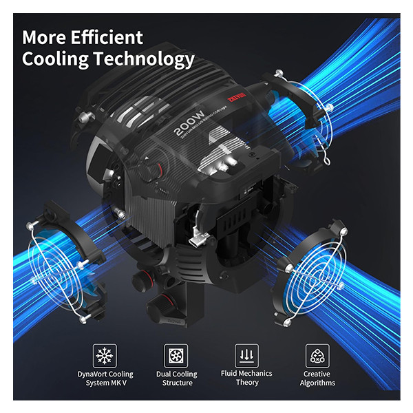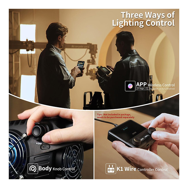 | ویژگی ها | طراحی مونو (تکمنظوره) و فشرده , شدت نور بالا، دمای رنگ قابل تنظیم (2700 تا 6500K) , CRI و TLCI بالای ۹۵، دقت رنگ عالی , سیستم خنککنندهی بیصدا DynaVort , بدنهی فلزی مقاوم، مناسب استفادهی حرفهای , کنترل بیسیم با اپلیکیشن ZY Vega , افکتهای نوری FX، نورپردازی سینمایی |