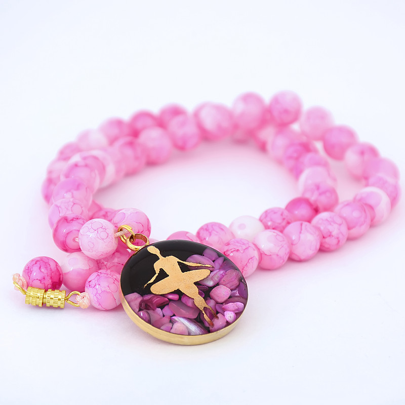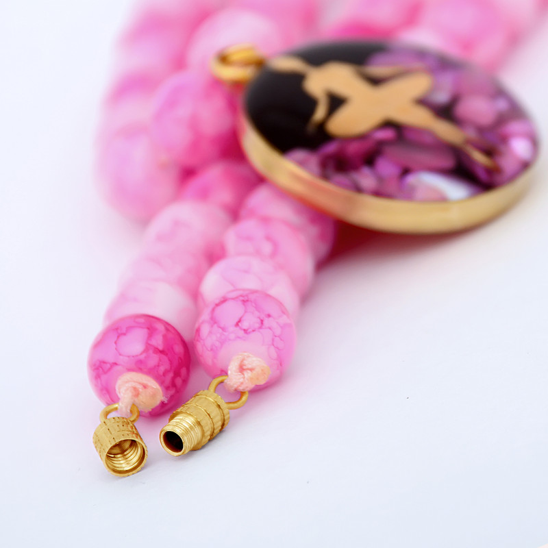 نیم ست بالرین با زنجیر سنگ های صورتی رنگ یکی از زیبا ترین محصولات دست ساز می باشد که در آن با ورق روکش طلا 24 عیار باکیفیت ، این اثر جذاب تولید شده است. رنگ سنگ های این محصول کاملا خاص بوده و دارای رگه هایی نیز می باشد که این اثر را هرچه بیشتر زیباتر کرده است. این نیم ست کاملا دست ساز میتواند هدیه ای با ارزش برای یک مادر یا یک دوست و یا همراه مخصوصا برای هدیه دادن در مناسبت های مختلف باشد . تمام تلاش ماخلق زیبایی های است ماندگار و متفاوت برای کسانی که طالب داشته هایی منحصر به فرد اند . شکل بالرین ساخته شده از روکش طلا می باشد که درخشندگی خیلی محسور کننده ای به گردنبند و دستبند می بخشند. گردنبند و دستبند بالرین با طلای 24 عیار روکش شده و دقت بسیار بالایی در ساختار بدنه و نگین دارد . یکی دیگر از ویژگی های این محصول زنجیر آن است که کیفیت بالایی دارد و طول آن 46سانتی متر است و براحتی می توان روی لباس های بیرون یا از داخل استفاده کرد تا کامل چشم نوازی کند و با همه انواع لباس ها ، خیلی عالی بنظر خواهد رسید.ولی بیشتر از داخل لباس ( گردنی) استفاده میشود. این محصول گزینه بسیار مناسب و با صرفه برای هدیه دادن در شب یلدا ، ولنتاین و دیگر مناسبت ها می باشد.