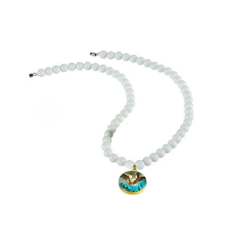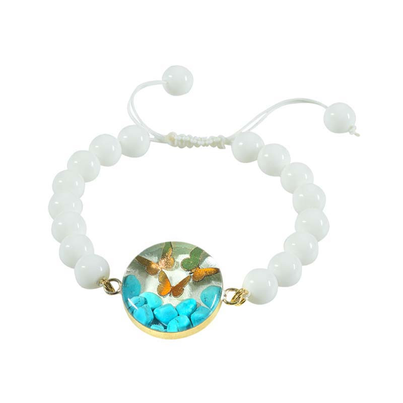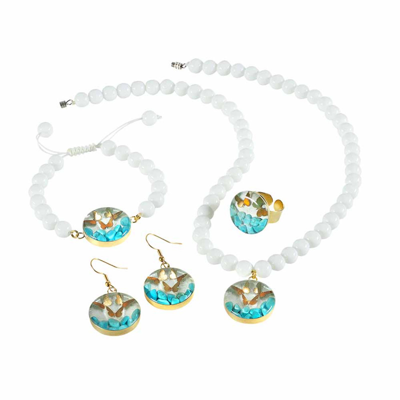 پلاک سنگی گردنبد، دستبند، انگشتر و گوشواره این مجموعه، ترکیبی است از سه پروانه روکش طلا با سنگ های ریز فیروزه ای آبی رنگ که چنین ترکیبی این محصول را منحصر بفرد کرده است.