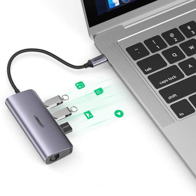 هاب 4 پورت یوگرین با بدنه آلومینیومی میباشد. این هاب دارای 4پورت مختلف جهت استفاده های گوناگون طراحی گردیده است و دارای یک TYPE-C جهت اتصال به دستگاه های مختلف است و باقی این پورت ها عبارت اند از: 3 پورت USB 3.0 که قابلیت انتقال اطلاعات تا سرعت 5Gpbs ، یک پورت شبکه RJ45 با سرعت 10/100/1000 جهت اتصال دستگاه شما به شبکه از طریق کابل میباشد. با توجه به طراحی امروزه لپتاپ ها جهت نازک تر شدن مجبور به حذف این پورت ها شده اند ولی این هاب تمام پورت های مورد نیاز شما را یک جا در خود جمع کرده است.