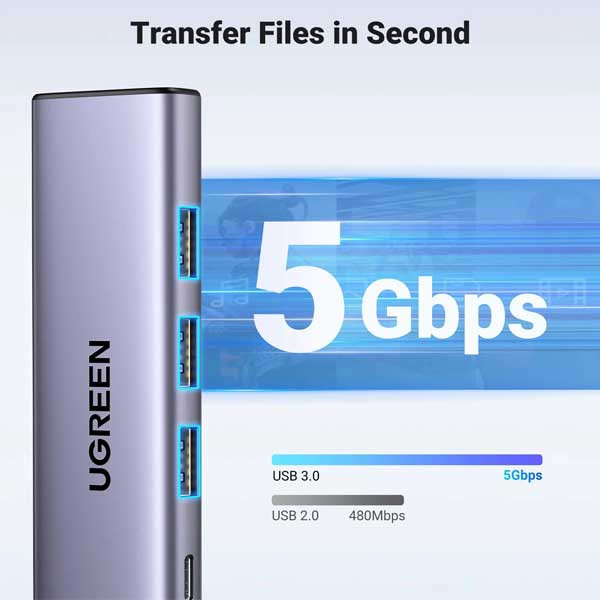 همه پورت‌های USB این هاب از USB 3.0 با سرعت انتقال داده تا ۵ گیگابیت بر ثانیه پشتیبانی می‌کنند. این سرعت بالا، انتقال سریع اطلاعات را تضمین می‌کند.