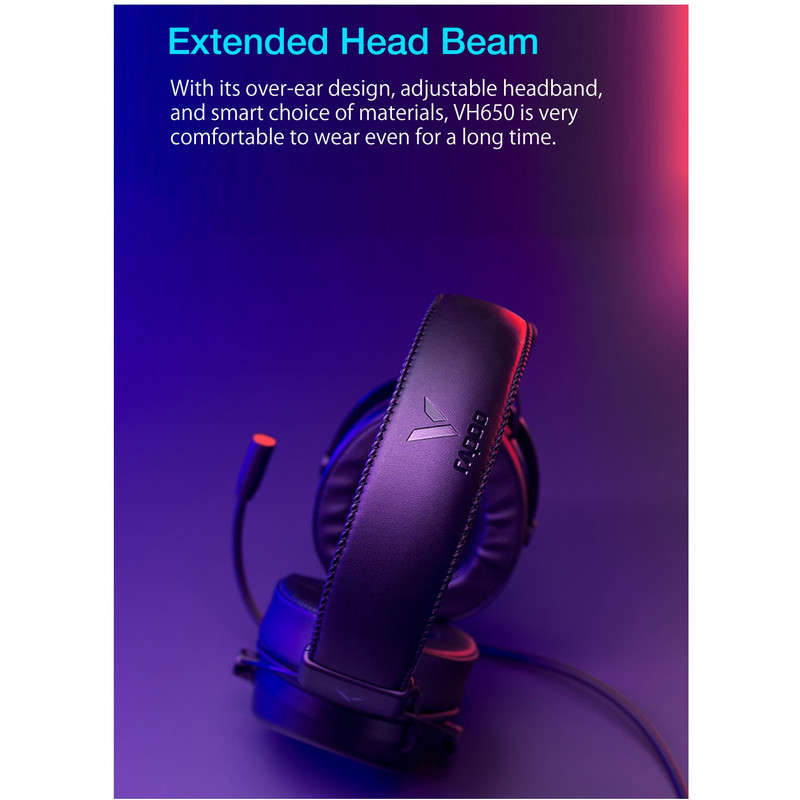 هدست بازی مجازی 7.1 کاناله VH650 است که وزن خالص آن حدود 336 گرم است. این هدست Rapoo در رنگ بنفش مه آلود و مشکی شب تیره موجود است و بازیکنان زن و مرد میتوانند استفاده کنند. شکل کلی آن گرد است و طراحی پوسته هدفون بهترین آلیاژ از سری Vpro میباشد که نسبت به VH710 گردتر و سبکتر است که بهینهسازی خوبی نیز محسوب میشود.پرتو هدست گیمینگ مجازی 7.1 کاناله RGB Rapoo VH650 از جنس فلز است. مقاومت خمشی عالی دارد، می تواند خمش های مختلف را با مقاومت بالا تحمل کند و به صورت عمودی تا 2 سانتی متر کشیده می شود که برای استفاده روزانه مشکلی ندارد.هدبند هدست را می توان با توجه به شکل سر بازیکن تنظیم کرد تا بهتر به سر ما برسد. سطح هدبند با پوست پروتئین پیچیده شده و با اسفنج 2 میلی متری مقاوم در برابر هیدرولیز پر شده است. مقاومت بالشتکی بسیار خوب است. پوشیدن آن بر روی سر به وضوح می تواند فشار روی سر را کاهش دهد و زندگی و تجربه استفاده را می توان تضمین کرد.پوسته یونیت هدفون از مواد PC ساخته شده است و یک نوار ساطع کننده نور RGB در قسمت بیرونی طراحی شده است. نور هدست به اندازه کافی روشن است و تغییرات رنگ ملایم است که برای افزایش جلوه بصری کافی است. کنترل پنل عملکرد هدست بازی 7.1 کاناله RGB مجازی Rapoo VH650 روی پوسته گوشی سمت چپ تعبیه شده است که می تواند صدا را تنظیم کند، میکروفون و نور را باز و بسته کند .این هدست مجهز به کابل لاستیکی شش هسته ای به طول 245 سانتی متر است که مقاومت خمشی خوب و نرمی عالی دارد. مهم نیست که کنسول یا کامپیوتر شما در کجا قرار می گیرد، این کابل برای شما کافی است. بعلاوه، USB آن برای عمر طولانیتر و مشکلات کمتر زنگزدگی، روکش طلا دارد.