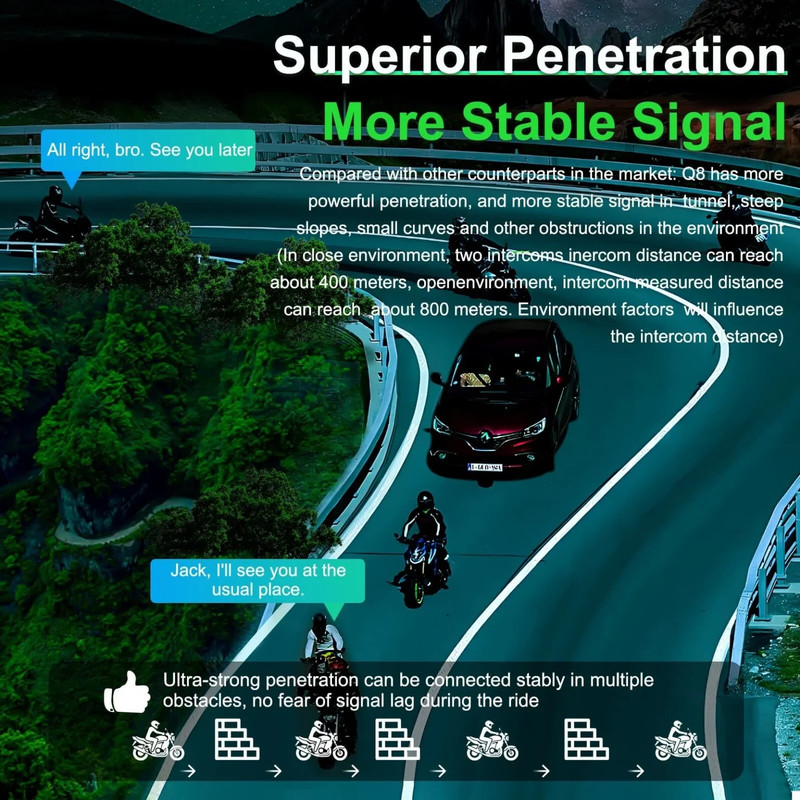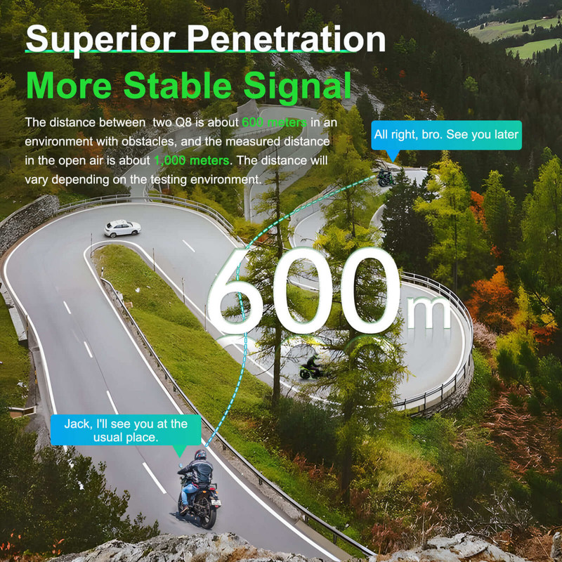 سایر توضیحات سیستم ارتباط داخلی موتورسیکلت EJEAS Q8 MESH EJEAS Q8 از MESH 3.0 استفاده می‌کند ، مکالمه همزمان برای ۶ نفر، اتصال مجدد خودکار ۵ میلی‌ثانیه، تعداد نامحدود کاربر برای گوش دادن، نفوذ قوی، اتصال پایدار، پشتیبانی از اشتراک‌گذاری موسیقی. فناوری جدید مش، سطح جدیدی از اتصالات قوی و قابل اعتماد و کانال‌های اطلاعاتی هوشمند و انعطاف‌پذیر اینترکام را به ارمغان می‌آورد. سرعت پاسخ اتصال در عرض 5 میلی‌ثانیه، انتقال پایدار داده‌ها را در شرایط چالش‌برانگیز و سخت تضمین می‌کند. علاوه بر این، از طریق پیشرفت‌های مداوم در تحقیقات فناوری، شبکه مش نفوذ فوق‌العاده قوی دارد و از محدودیت‌های دیوارها و سایر موانع برای دستیابی به ارتباط پایدار عبور می‌کند. شبکه مش در سخت‌ترین شرایط آزمایش و تأیید شده است تا خط ارتباطی با شرکای دوچرخه‌سواری شفاف و پایدار باشد. ارتباط چند کاناله دو حالت مختلف ارتباط داخلی برای مسافران در دسترس است: ارتباط داخلی مش گروهی و ارتباط داخلی بلوتوث. مکالمه گروهی خصوصی، حالت Group Mesh Intercom را انتخاب کنید. Group Mesh از یک گروه خصوصی واحد تا 6 شرکت‌کننده پشتیبانی می‌کند و به کاربران اجازه می‌دهد تا در حالت Mesh Intercom بین 5 کانال مختلف جابجا شوند. برای اطمینان از حریم خصوصی، فقط کاربران دعوت‌شده می‌توانند به Group Mesh Intercom بپیوندند. حالت ارشبکه ارتباطی قوی و قابل اعتماد. 6 نفر می‌توانند همزمان صحبت کنند.تباط داخلی بلوتوث دوطرفه سنتی همچنان گزینه‌ای برای اتصال سایر کاربران دارای بلوتوث است.از طریق اپلیکیشن EJEAS یک گروه ارتباط داخلی راه‌اندازی کنید تا تعداد افراد و فاصله ارتباط داخلی را افزایش دهید.با گروه‌های مختلف از طریق ۵ کانال ارتباط برقرار کنید.این دستگاه دارای قدرت نفوذ قوی و سیگنال پایدار در محیط‌هایی با موانعی مانند تونل‌ها، شیب‌های تند و پیچ‌ها است.سازگار با پلتفرم بلوتوث ۵.۱. قابلیت مکالمه دو نفره از طریق بلوتوث.در صورتی که سایر دستگاه‌های مخابره داخل ساختمان یک تیم تشکیل داده باشند، می‌توانید از طریق جفت شدن، شنونده تیم شوید.محدوده مخابرات 1 کیلومتر،قابلیت کاهش نویز افزایش یافته است و کیفیت صدا حتی اگر سرعت خودرو افزایش یابد، واضح باقی می‌ماند.پشتیبانی از قطع میکروفون، مناسب برای سناریوهای تقاضای بیشتر.به ایستگاه‌های رادیویی FM محلی گوش دهید.اینترکام 5G از قدرت فناوری شبکه تلفن همراه برای دستیابی به ارتباطی سریع، قابل اعتماد و ایمن استفاده می‌کند. این فناوری انتقال صدای با کیفیت بالا، پوشش بهتر، تأخیر کمتر و بهبود توانایی چندین کاربر برای برقراری ارتباط موثر در مناطق مختلف را فراهم می‌کند. اینترکام مش یک شبکه ارتباطی است که می‌تواند کاربران نامحدودی را به هم متصل کند. کاربران می‌توانند به سایر کاربران نزدیک در همان شبکه مش متصل شوند. محدودیتی در تعداد افرادی که همزمان صحبت می‌کنند وجود دارد، اما هیچ محدودیتی در تعداد افرادی که گوش می‌دهند وجود ندارد. ارتباط خصوصی، امنیت تضمین شده. بلوتوث اینترکام یک روش ارتباطی نقطه به نقطه زنجیره‌ای است که به حداکثر ۴ دستگاه اجازه می‌دهد تا به طور همزمان ارتباط برقرار کنند. مزایای اینترکام مش اینترکام مش حتی در سخت‌ترین و چالش‌برانگیزترین شرایط نیز بدون هیچ گونه تداخلی از طریق وای‌فای، برق یا سایر سیگنال‌های ارتباطی کار می‌کند. با استفاده از شبکه مش، اتصال مجدد دستگاه‌ها ساده است. اگر هر کاربری از محدوده گروه خارج شود یا آن را ترک کند، می‌تواند به راحتی و با وارد کردن مجدد آن محدوده، بدون نیاز به وارد کردن دستی، دوباره به آن گروه بپیوندد. با استفاده از رابط کاربری مش (Mesh Intercom)، می‌توانید به سطح بی‌سابقه‌ای از ارتباط قابل اعتماد برای افزایش اتصال تیمی دست یابید. تیم‌های دارای قابلیت مش، بیش از هر زمان دیگری در ارتباط باقی می‌مانند و بهره‌وری بالاتر و همکاری تیمی بهتری را فراهم می‌کنند. یک سیستم ارتباطی قد