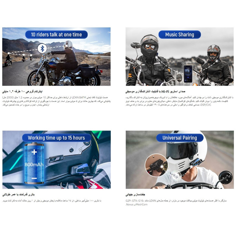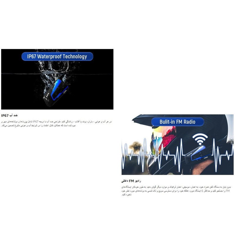 | سایر توضیحات | هدست کلاه کاسکت موتورسیکلت لکسین LEXIN B4FM، 10 عدد کلاه ایمنی مخصوص دوچرخهسواران، سیستم ارتباطی جهانی IP67 با قابلیت اشتراکگذاری موسیقی، حذف نویز، رادیو FM، مناسب برای اسنوموبیل، بسته 1 عددی اینترکام ۱۰ طرفه موتورسیکلت: مجهز به تراشه کوالکام و فناوری بلوتوث، بلوتوث کلاه ایمنی B4FM از مکالمه گروهی تا ۱۰ موتورسوار (بهترین حالت برای ۴ نفر) در فاصله ۲۰۰۰ متر / ۱.۲ مایل پشتیبانی میکند و اتصال سریع و قابل اعتماد، عمر باتری طولانیتر، صدای واضح، ویژگیهای متنوع و انتقال ایمن دادهها را فراهم میکند. اشتراکگذاری موسیقی و صدای استریو Hi-Fi: هدست بلوتوث کلاه ایمنی B4FM به دو سرنشین اجازه میدهد تا با دوبار کلیک روی دکمه پاور از یک آهنگ لذت ببرند. این هدست دارای بلندگوهای کواکسیال مایلار، میکروفونهای مقاوم در برابر باد و فناوری DSP/CVC برای کیفیت صدای سهبعدی بینظیر است. بیایید حتی با سرعت تا ۱۲۰ کیلومتر در ساعت از موسیقی شفاف لذت ببریم. هدست هندزفری و جفتسازی جهانی: B4FM از جفتسازی با اکثر هدستهای موتورسیکلت، از جمله مدلهای LEXIN (G2P، GTX، G16، MeshCom، Novus) و برندهای مختلف دیگر پشتیبانی میکند. این سیستم ارتباطی موتورسیکلت همچنین به شما امکان میدهد با استفاده از Siri و سایر دستیارهای صوتی تماس برقرار یا دریافت کنید. ضد آب IP67 و مدت زمان باتری استثنایی: سیستم ارتباطی کلاه ایمنی B4FM که با پورتها و دوشاخههای ضد آب طراحی شده است، در آب و هوای متنوع، حتی در دمای -22 درجه فارنهایت، بینقص عمل میکند. باتری قوی 800 میلیآمپر ساعتی آن تا 15 ساعت پخش موسیقی یا مکالمه و بیش از 168 ساعت زمان آماده به کار را ارائه میدهد. میکروفون قابل تعویض و سازگاری با کلاه کاسکت عریض: این بلندگوی کلاه کاسکت شامل ۲ نوع میکروفون است، یک میکروفون Boom برای کلاه کاسکتهای روباز یا تاشو، و یک میکروفون دکمهای برای کلاه کاسکتهای تمامصورت. این بلندگو برای همه فعالیتهای فضای باز، نه فقط موتورسواری، ایدهآل است. |