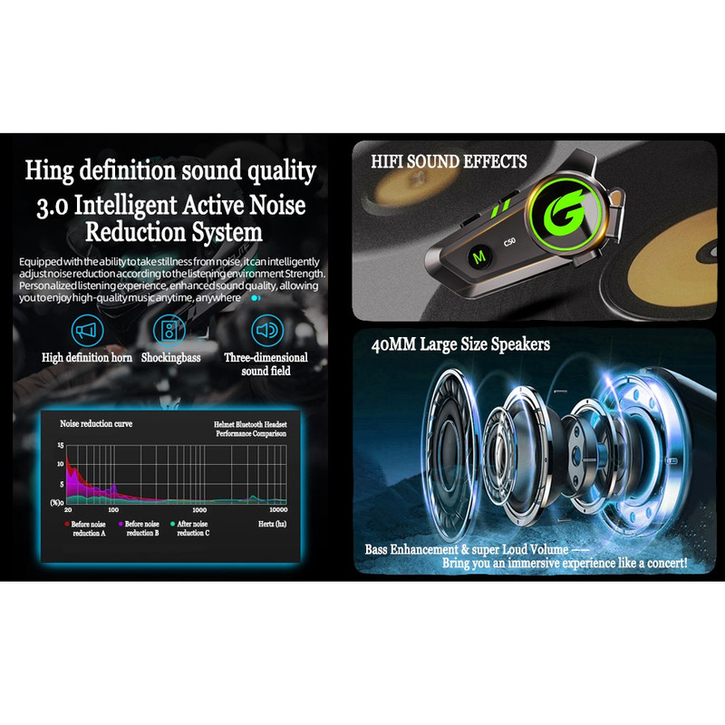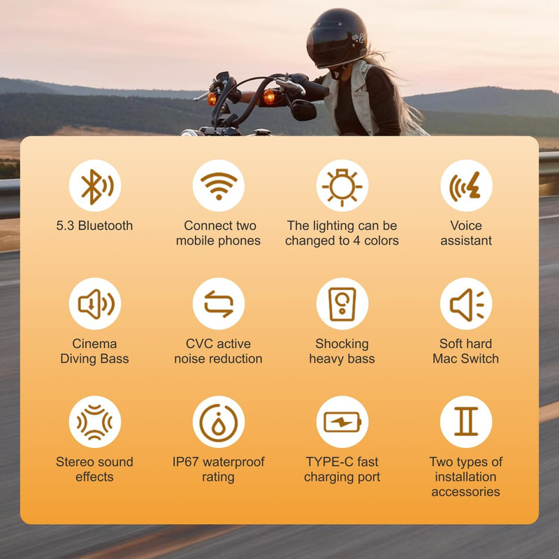 سایر توضیحات هدست کلاه کاسکت موتورسیکلت مدل C50بلندگوهای کلاه ایمنی موتور سیکلت ، هدفون کلاه ایمنی موتور سیکلت با قابلیت اشتراک گذاری موسیقی بلوتوث، حذف نویز مضاعف، باس قوی/IP67، ضد آب، سازگار با همه کلاه ایمنی ها، 1500 میلی آمپر ساعت استریو های-فای و کاهش نویز قوی : بلندگوهای کلاه ایمنی موتورسیکلت پیکربندی دیافراگم گرافن ۴۰ میلی‌متری برای کیفیت صدای عالی در موسیقی و تماس‌ها. حذف نویز دوگانه میکروفون و اسفنج ضد باد، تماس‌های واضح‌تری را امکان‌پذیر می‌کند. در عین حال، نورپردازی را می‌توان به ۴ رنگ تغییر داد که می‌توانند آزادانه تغییر کنند. پاسخ خودکار و بلندگوی فوق العاده نازک : C50 دارای یک سیستم دستیار صوتی هوشمند است. شما می‌توانید به سادگی دکمه کنترل صدا را روی هدست کلاه ایمنی فشار دهید و به راحتی دستیار صوتی یا سیری خود را برای اقدام بدون توجه به جاده فعال کنید. بلندگوها تنها 10 میلی‌متر ضخامت دارند و با همه کلاه‌های ایمنی سازگار هستند و تجربه راحتی را برای شما فراهم می‌کنند. گیره پشتی نیاز به پیچ‌های دست و پا گیر را از بین می‌برد و به راحتی روی کلاه ایمنی نصب و جدا می‌شود و سفر را راحت‌تر می‌کند. بلندگوهای چند منظوره کلاه ایمنی موتور سیکلت : هدست موتور سیکلت از فناوری بلوتوث 5.3 بهره می‌برد که به طور موثر قطع ارتباط و نویز ناشی از تداخل در باند فرکانسی 2.4 گیگاهرتز را کاهش می‌دهد. این هدست نه تنها از حذف نویز هوشمند و دستیار صوتی پشتیبانی می‌کند، بلکه می‌تواند همزمان دو گوشی هوشمند را نیز متصل کرده و نیازهای مختلفی مانند ناوبری/تماس/گوش دادن به موسیقی را به طور همزمان برآورده کند. باتری بزرگ ۱۵۰۰ میلی‌آمپر ساعتی و زمان سواری طولانی : دارای یک باتری قابل شارژ ۱۵۰۰ میلی‌آمپر ساعتی داخلی است و می‌تواند تنها در ۶۰ دقیقه به طور کامل شارژ شود. این دستگاه ۴۲ ساعت پخش موسیقی، ۴۲ ساعت مکالمه بدون توقف و تا ۱۸ ماه زمان آماده به کار را ارائه می‌دهد، از شارژ سریع TYPE-C پشتیبانی می‌کند و باتری را روی تلفن نمایش می‌دهد. می‌تواند برای مدت طولانی در فضای باز سواری کند و مشکل شارژ شما را حل کند. ضد آب با استاندارد IP67 و کنترل پخش : بلندگوهای کلاه ایمنی موتورسیکلت جدید C50 با استاندارد IP67 ضد آب هستند و به شما کمک می‌کنند تا در تمام شرایط آب و هوایی مانند گرد و غبار، باران، طوفان، برف و دمای پایین -20 درجه فارنهایت (20- درجه سانتیگراد) دوام بیاورید. هدست موتورسیکلت همچنین عملکردهای راحت و سریعی مانند دستیار صوتی، پاسخگویی خودکار و شماره گیری مجدد آخرین شماره را ارائه می‌دهد.