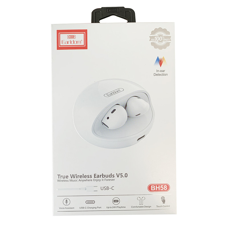 هندزفری بلوتوثی wireless دو گوشی مدل ET-BH58 ارلدام طرح مدیران، محصولی است که با طراحی بسیار زیبا و خاصی ساخته و پرداخته شده است برای راه اندازی اولیه کافی است قسمت دایره شکل روی محفظه شارژر را 180 درجه بچرخانید تا چراغ سبز رنگ آن روشن شود ، سپس آن را در بخش بلوتوث دستگاه خود پیدا کرده و به آن متصل کنید . در هر مرحله پیام های صوتی مبنی بر اتصال ، قطع ، روشن و یا خاموش بودن و حتی تماس های ورودی از این طریق به شما گوشزد می شود .این محصول بسیار سبک و با کابل USB_C که در پک آن موجود است شارژ می شود . در ابتدا لامپ شارژر و جعبه کوچک آن به رنگ قرمز است و زمانی که به طور کامل شارژ شد این لامپ به رنگ سبز در می آید . شارژر و محل نگهداری(کیس) آن طوری طراحی شده که هم به عنوان جعبه نگهدارنده محصول از آن استفاده می شود و هم پایه شارژ این گوشی زیبا و سبک به عبارت دیگرهم گوشی دارای باطری است . صدای واضح و گیرایی میکروفن این محصول نیز از مزایای دیگر آن به شمار می رود.