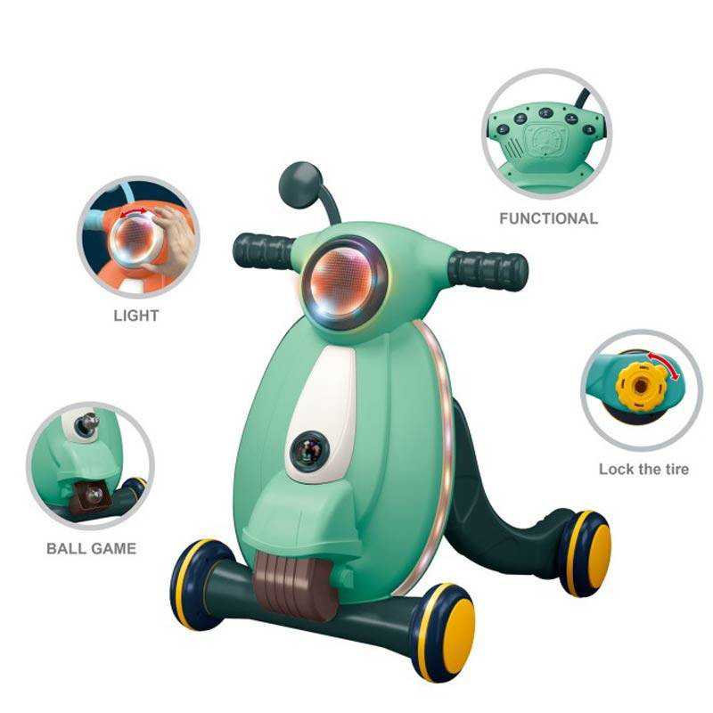 این واکر برای اولین قدم های کودک طراحی شده و پس از آن مانند یک اسکوتر قابل استفاده است.یک پنل در جلوی موتور رو به کودک وجود دارد که دارای دکمه های پخش موزیک، کم و زیاد کردن و روشن کردن چراغ موتور است.چرخ های عقبی این واکر دارای قفل ترمز است؛ این قابلیت برای زمانی است که نمی خواهید واکر حرکت کند.یک عدد توپ گردونه روی موتور دارد که دارای دانه های رنگی است.این توپ از جای خود خارج می شود و کودک می تواند دوباره آن را در جای خود قرار دهد.دسته های موتور به گونه ای است که کودک می تواند به راحتی آن را بگیرد.ساختار این محصول هیچ گونه فشاری به کمر و پاهای کودک وارد نمی کند.طراحی زیبا و جذاب این محصول برای کودک، سبب اشتیاق او به استفاده از آن می شود.این محصول برای کودکان بالای 1 سال توصیه می شود.در دو رنگ سبز و نارنجی موجود است.تهیه شده از جنس پلاستیک مقاوم است.ابعاد این موتور 43 x 45 x 52 سانتی متر است.نیازمند 3 عدد باتری قلمی است.مونتاژ و سرهم بندی این موتور بسیار ساده است.بازی با این واکر به تقویت مهارت های حرکتی و قدرت عضلات کودک کمک می کند.همچنین داشتن صدای موزیکال سبب ارتقای قدرت شنوایی کودک می شود.