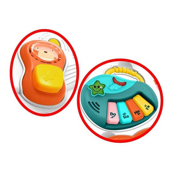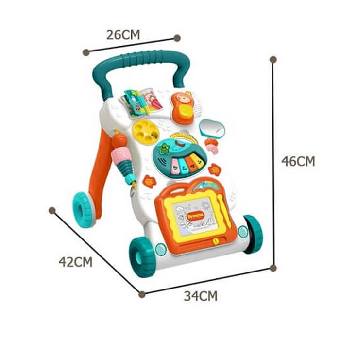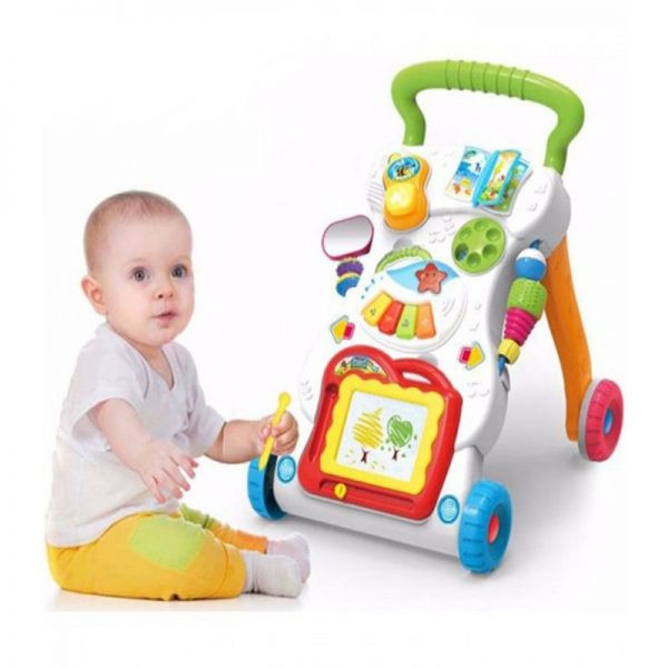 سایر توضیحات | دارای موبایل، دفترچه، صفحه آهنربایی، شماره گیر تلفن و… امکان استفاده به صورت نشسته و ایستاده دارای چند عدد جغجغه در کناره واکر, قابلیت استفاده جداگانه از لوازم موجود بر روی واکر مناسب برای آموزش اعداد، رنگها، اشکال و صداها کارکرد با دو باتری قلمی 1٫5 ولتی |