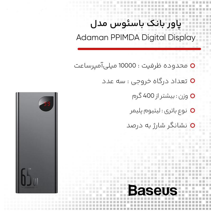 | مشخصات فنی | شارژ سریع 65 واتی با قابلیت پشتیبانی از پروتکل های شارژ سریع SCP, QC. PD دارای 2 پورت ورودی جهت شارژپاوربانک Micro USB و Type-C دارای سه پورت خروجی USB-A1 و USB-A2 و Type-C نوع باتری: لیتیوم پلیمر |