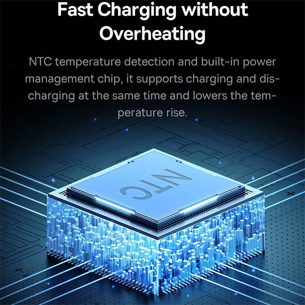 پاوربانک بیسوس PPXJ060001 دارای یک چیپ هوشمند بوده که با توجه به توان ورودی دستگاهی که به آن وصل میکنید، توان خروجی پاوربانک را تنظیم میکند.