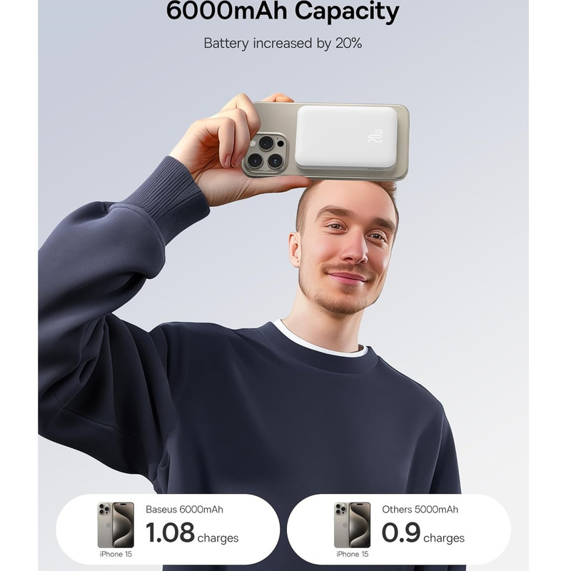 𝟔𝟎𝟎𝟎𝐦𝐀𝐡، 𝐋𝐚𝐫𝐠𝐞𝐫 𝐂𝐚𝐩𝐚𝐜𝐢𝐭 : ظرفیت باتری ما 6000mah است که 1000mah بیشتر از مارک های دیگر است. برای کاربران آیفون، این به معنای افزایش حدود 20 درصدی قدرت است. این دستگاه میتواند آیفون 15 را از 0% تا 100% شارژ کند و فرآیند شارژ کامل را تکمیل کند.