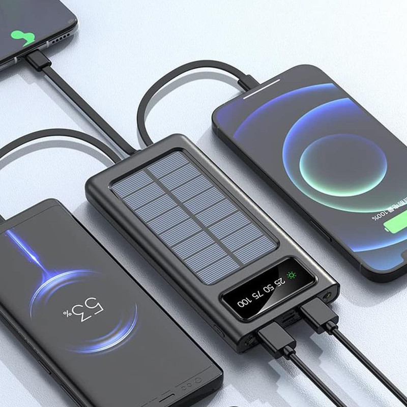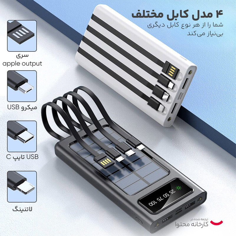 این پاوربانک به جز قابلیت شارژ از طریق نور خورشید شما را از همراه بردن کابل برای شارژ گوشی خود هم بی نیاز میکند. 3 مدل کابل Lightinig ، Micro USB و USB Type-C برای شارژ کردن دستگاه های دیگر در قسمت پشت این مجصول قرار گرفته شده است.