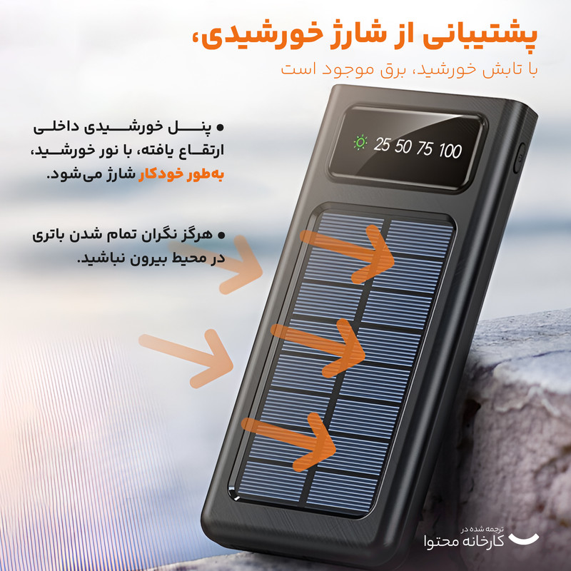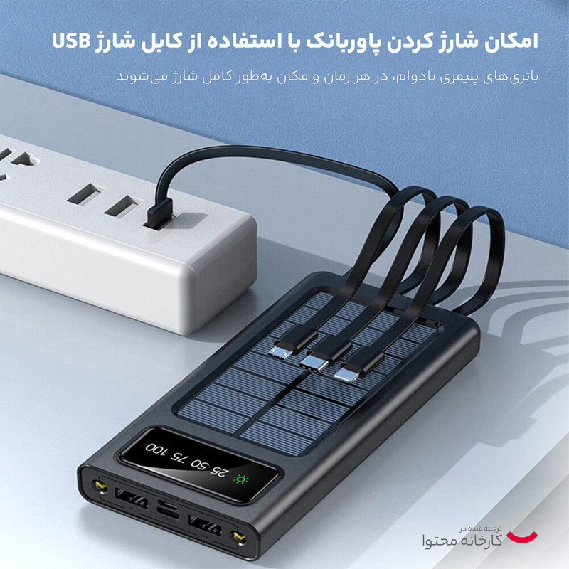 xxخود پاوربانک هم علاوه بر نورخورشید هم با کابل شارژر Type-C و هم با Micro USB شارژ میشود.