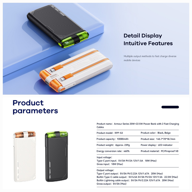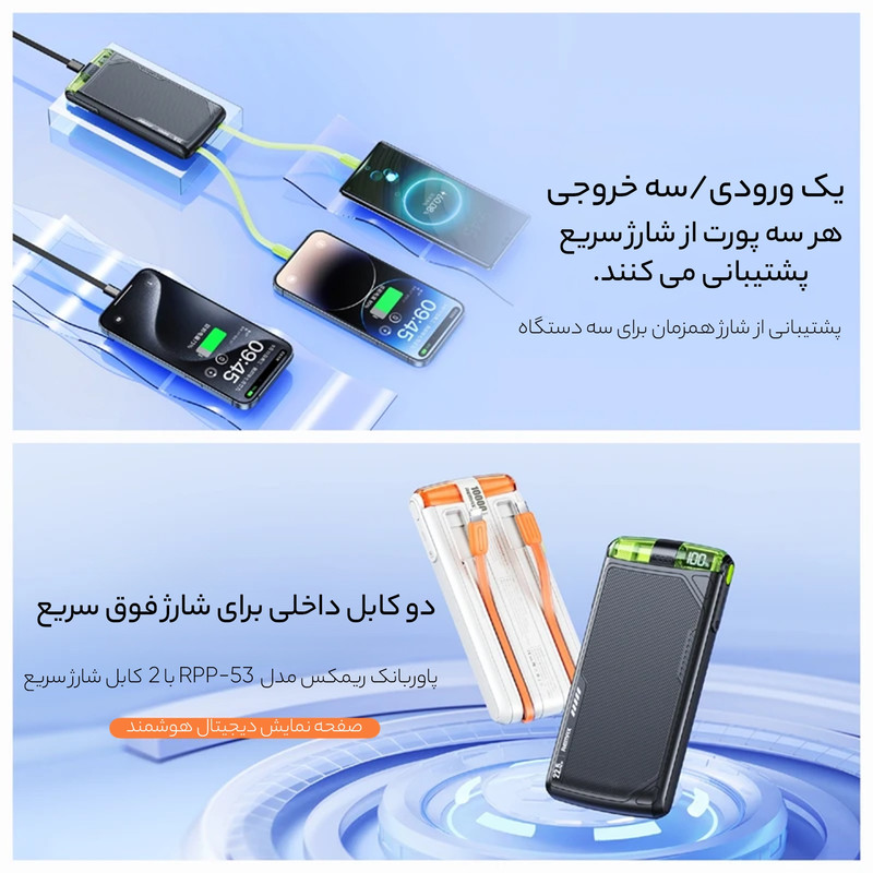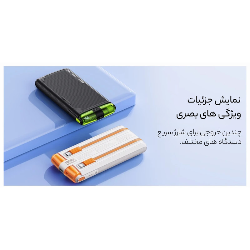 امکانات و قابلیتها | شارژ موبایل و تبلت با سرعت 22.5w شارژ خود پاوربانک با سرعت 18w دارای 2 عدد کابل سرخود |