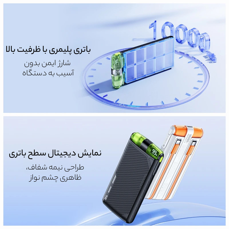 مشخصات فنی | ظرفیت 10000 میلی آمپر ساعت دارای 1 عدد کابل تایپ c سرخود با قدرت خروجی 22.5W دارای 1 عدد کابل لایتنینگ سرخود با قدرت خروجی 20W دارای 1 عدد خروجی تایپ C دارای سرعت شارژ 18W |