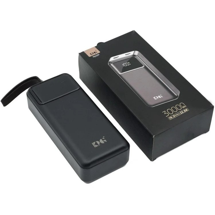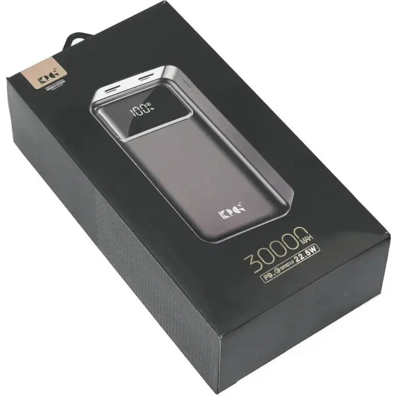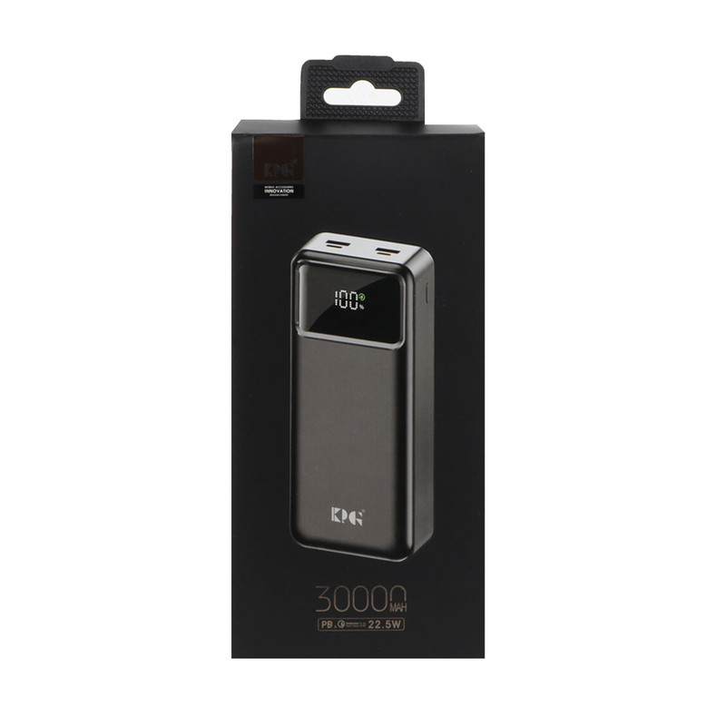 پاوربانک KPG 302 با وزن 690 گرم دارای باتری با ظرفیت 30000 میلی آمپر است و از طراحی جذابی بهره میبرد. بدنه پاوربانک KPG مدل 302 براق است و اثر انگشت را به صورت محدود جذب میکند. بر روی بدنه دارای نمایشگری برای نشان دادن میزان شارژ موجود میباشد و دارای 4 درگاه خروجی شارژ از نوع USB و USB-C و Lightning میباشد. پاوربانک KPG از شاژ سریع PD و QC3.0 برخوردار است و از شدت جریان خروجی 2.0 آمپر پشتیبانی میکند. توان خروجی پاوربانک KPG برابر با 22.5 وات میباشد و میتوانید به صورت همزمان 4 گوشی مختلف را شارژ نمایید. درون باکس شارژر کابل شارژ USB-C قرار دارد.