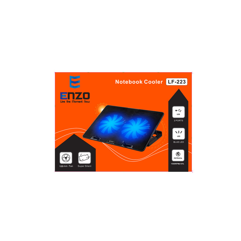 پایه ی خنک کننده و نگهدارنده لپ تاپ ENZO LF-223 در ابعاد جمع و جور مناسب لپ تاپ های تا 15.6 اینچ طراحی شده است. دارای دو عدد فن سایز بزرگ 12.5 سانتی است که دارای قابلیت نورپردازی LED می باشد. جنس بدنه این محصول از فلز آلومینیوم و پلاستیک ABS می باشد که از انتقال حرارت و مقاومت خوبی برای استفاده برخوردار است. همچنین پایه ی خنک کننده ENZO LF-223 قابلیت تغییر و تنظیم ارتفاع در چهار حالت مختلف را دارد که می تواند برای استفاده های مختلف بسیار مناسب باشد. ENZO LF-223 دارای دو گیره در قسمت جلویی محصول برای جلوگیری از سر خوردن لپ تاپ می باشد.