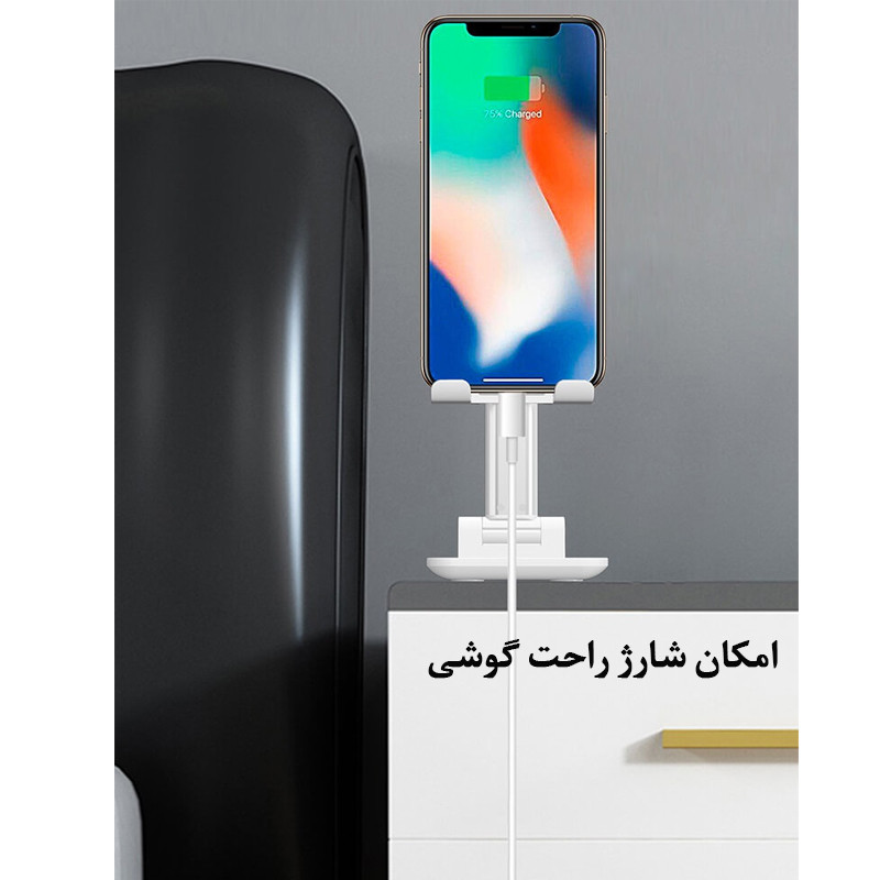 پایه نگهدارنده گوشی موبایل میباشد.مناسب برای همه نوع گوشی موبایل است متریال این پایه از جنس : Metal + silica gel +ABS است.قابلیت تغییر ارتفاع از 12 تا 16 سانتی متر را دارد تغییر زاویه قرارگیری موبایل تا 85 درجه را برای کاربر فراهم می آورد.امکان شارژ راحت گوشی / تنظیم بهترین زاویه دید /نگهداری کاملا ایمن گوشی / قراردادن راحت گوشی/ وجود پدهای سیلیکونی که مانع از سرخوردن گوششی میشود/ سایز کوچک و قابل حمل (قالبیت تا شوندگی) / را دارد.