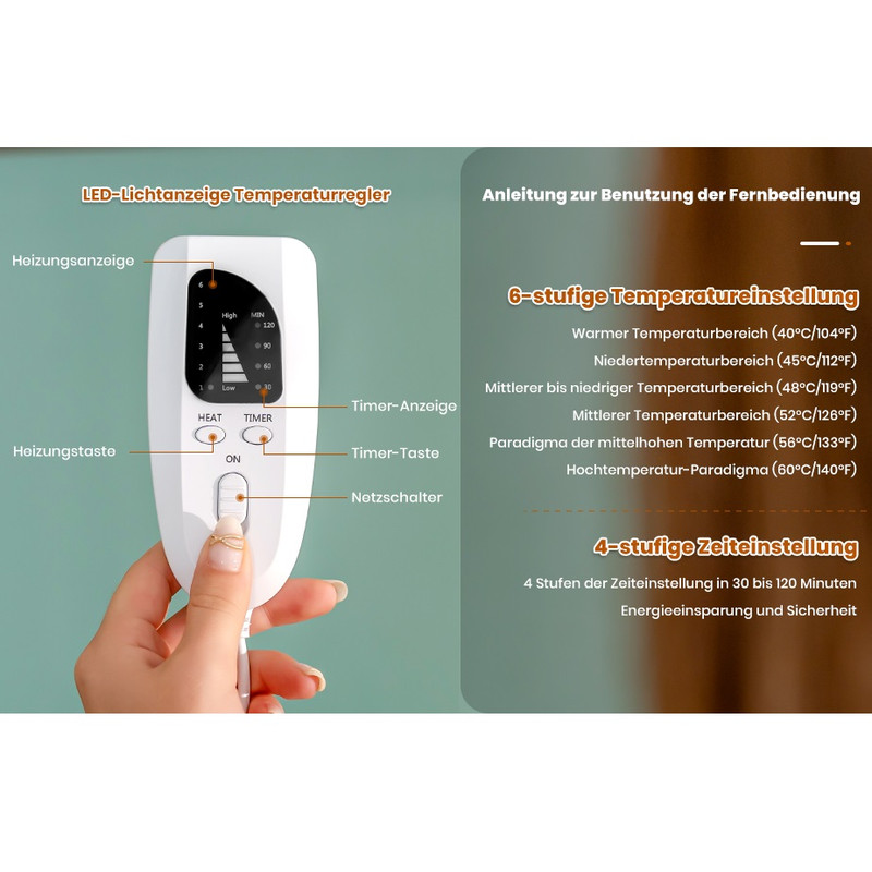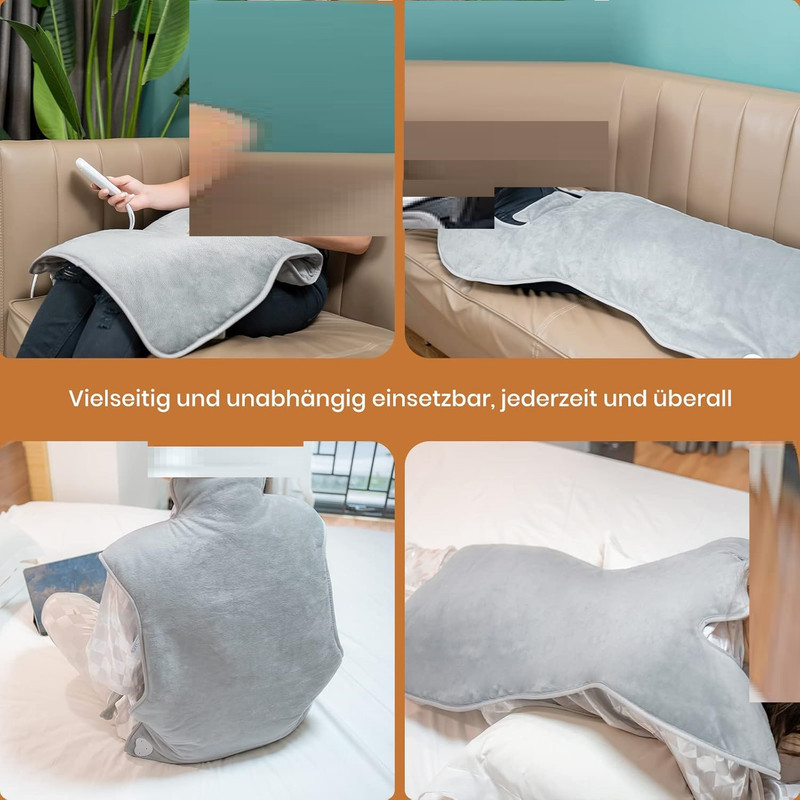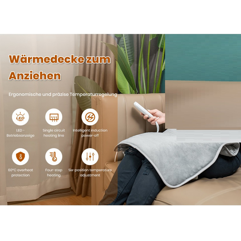 نرم و راحت: با وجود سطح گرمایش بزرگ، به لطف رویه پارچهای پشمی، گرمایش تمام بدن ما به طور ویژه قابل تنفس است. یک محافظ گرمای بیش از حد داخلی نیز دما را کنترل میکند و پتوی حرارتی را به موقع خاموش میکند. یک محافظ گرمای بیش از حد داخلی نیز دما را کنترل میکند. میتوان از آن در اتاق نشیمن، اتاق خواب و دفتر کار که منبع تغذیه در دسترس است استفاده کرد.