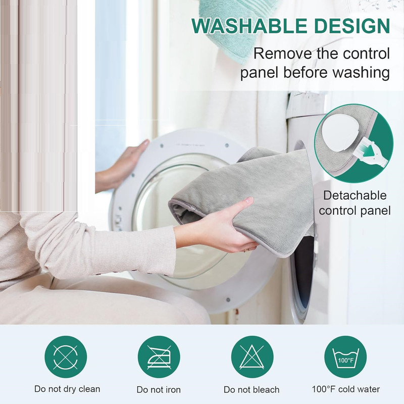 تمیز کردن آسان و قابل شستشو با ماشین لباسشویی: اتصال برق پد گرمایشی ضد آب است، وقتی دوشاخه برق پد گرمایشی از پنل کنترل جدا شود، پدهای گرمایشی را میتوان در ماشین لباسشویی شست، بنابراین نیازی به تمیز کردن آنها نیست. مهم: سیم برق و کنترلها را نباید در ماشین لباسشویی قرار داد. پس از تمیز کردن پدهای گرمایشی، قبل از استفاده باید خشک شوند.