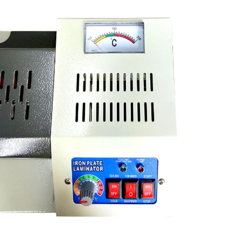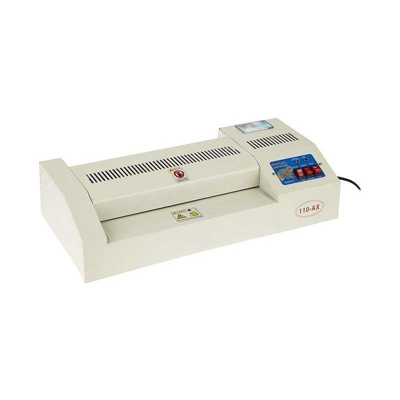 دستگاه پرس لمینت ax-110-a3 از نوع لمینت سرد و گرم است که تا سایز a3 لمینت میکند همچنین بدنه دستگاه کاملا فلز و دارای 4 غلطک است و دارای دکمه رفت و برگشت میباشد