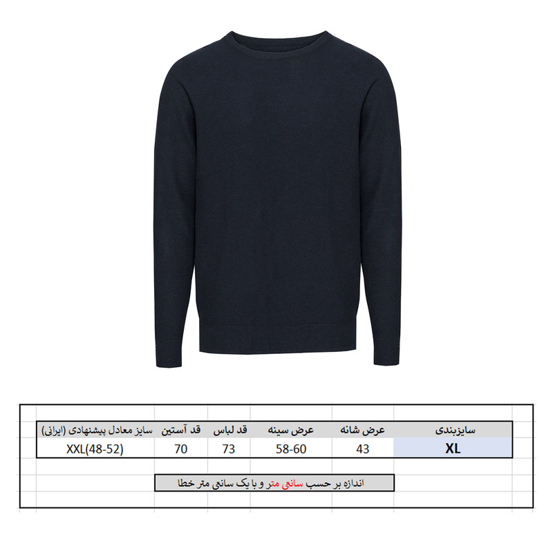 جزئیات | سایزبندی این محصول بر اساس سایز آلمانی و قواره دار است، لطفأ به جدول سایز دقت فرمایید. بافت ابن پلیور طرح ریز دارد و رنگ آن سورمه ای تیره است. |
