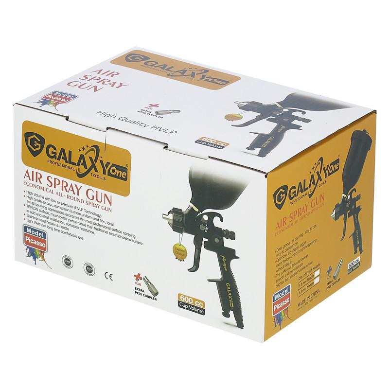 پیستوله رنگپاش بادی حرفه ای گلکسی وان مدل پیکاسو دارای سه پیچ تنظیم (پیچ تنظیم میزان ورودی باد، پیچ تنظیم میزان خروجی رنگ و پیچ تنظیم پهنای پاشش) می باشد. کاسه این پیستوله از جنس پلاستیک با ظرفیت 600 میلی لیتر، سوزن و نازل این پیستوله از جنس استیل ضد زنگ، کلاهک پیستوله از جنس برنج می باشد. به منظور استفاده آسان تر یک عدد کوپلینگ اضافه PF20 در داخل هر جعبه پیستوله قرار داده شده که به راحتی به شلنگ باد فنری متصل می شود. علاوه بر رنگ آمیزی خودرو، از این پیستوله برای رنگ آمیزی ساختمان نیز استفاده میشود نازل تخصصی این مدل پیستوله 1/3 می باشد که نازل تخصصی برای رنگ آمیزی خودرو می باشد کیفیت و خوش دست بودن این پیستوله سبب شده که به یکی از پر طرفدار ترین پیستوله های کشور های همسایه ایران تبدیل شود