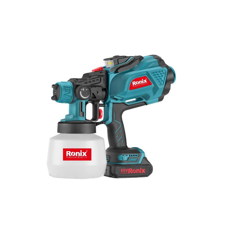 پیستوله رنگپاش شارژی 8604 رونیکس، نسل جدید پیستولههایی است که با مکانیزم حجم بالا- فشار پایین HVLP کار میکند. در این مکانیزم، حجم رنگ زیاد بوده و فشار هوا کم است. بنابراین، ذرات رنگی بیشتری روی سطوح مینشیند و در نتیجه، ضخامت رنگ بیشتر میشود. میتوان با تنظیم نازل از این پیستوله برای رنگکاری و پاشش حرفهای رنگ در جهات مختلف افقی، عمودی و گرد استفاده کرد.