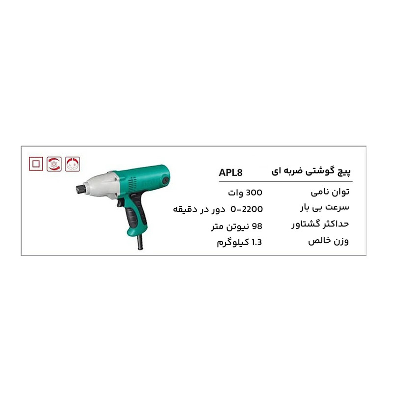پیچ گوشتی برقی دی سی ای مدل APL8 با قدرت 300 وات کار می کند و سرعت گردش آن در بالاترین حالت به 2200 دور در دقیقه می رسد .